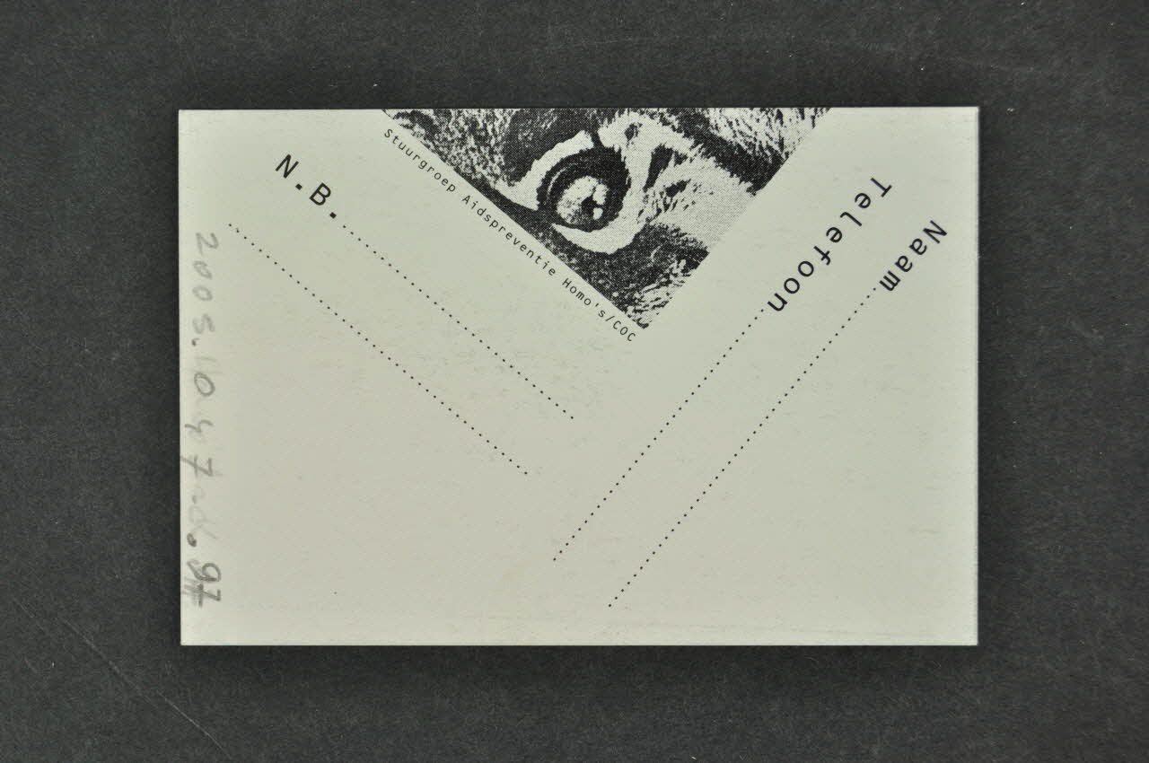 La carte est en carton imprimé noir sur fond blanc. Elle constitue une carte de rendez-vous. Au recto, des inscriptions blanches et un fragment de dessin de format carré se détachent sur une photographie en noir et blanc, représentant un groupe de six hommes assis autour d'une table avec des verres et des bouteilles. Ils observent un septième homme debout sur la table, nu, tenant deux crocodiles sur son corps. Au verso, sur fond blanc, des inscriptions noires disposées en biais encadrent le même fragment de dessin de format carré qu'au recto, illustrant l'oeil d'un félin. C'est sur cette face que le rendez-vous est pris, en inscrivant son nom et son numéro de téléphone.Inscriptions