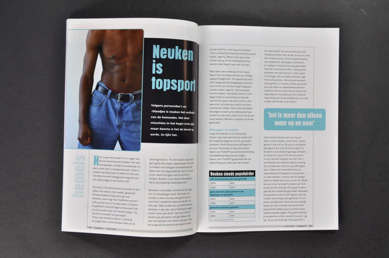 Couverture. Fond bleu. Deux jeunes gens enlacés dans la mer. En haut, en grandes capitales noires puis blanches : "Body / guard". A côté, petit écusson avec préservatif (sans doute logo de la revue) et, en noir : "als je lijf je lief is". Vers le bas, titres de quatre des articles. Tout en bas, en petits caractères blancs : été 2004 et, le logo de l'association "Schorer". Dos. Fond beige. 9 médaillons dans lesquels des têtes de jeunes hommes. En bas, en caractères noirs (sauf "het" en grands caractères blancs) "steeds meer mannen weten het". En dessous, texte sur le dépistage (traduire) et logo de l'association. Intérieur très coloré. Photos couleur en tête d'articles, pleines pages de prévention. Impression sur 2 colonnes en noir sur fond blanc. Titres et sous titres en vert, bleu, rose, rouge, orange, blanc, violet. Encarts verts, roses, bleu, gris impression noire, bruns, rose, jaune, verts, bleu, noirs , orange, impression blanc. - p.2 Photo couleur pleine page style BD, deux garçons face à face parlant du préservatif.. En bas, commentaire en petits caractères blancs et coordonnées de la ligne téléphonique : "Aids SOA Infolijn". - p.3 Editorial : Zoveel mannen, zoveel smaken (traduire) - p.4 Riskante relaties. Gescheurde condooms en gebroken beloftes. (signalé en couverture) - p.7 Photo couleur pleine page : homme allongé à plat ventre sur un lit, un autre homme s'éloigne. En surimpression en capitales bleues et blanches :"Zonder / Maar niet zonder meer" - p.8 Photo couleur pleine page. Jeune homme dans un lit, torse nu. A côté de lui préservatif usagé et enveloppes de préservatif déchirées. Sur le drap, en italiques noires :"ik kies voor veilig". En bas, bandeau vert avec texte sur le préservatif et le lubrifiant (traduire). (cf dos de la couverture de 2005.100.41) - p.9 Korte berichten. Snelle Hiv-test / 100 homo-vragen (présentation du livre2005.031.14) / Une nouvelle IST : LGV - p.10 Internetdating. Safe surfing. (Rendez vous sur internet : surfing safe) - p.13 Photo couleur pleine page : Photos de brochures ou dépliants. "Homo info nodig ? Shorer Helpdesk" Numéro de la ligne téléphonique de l'association. - p.14 Neuken is topsport (signalé en couverture) - p.18 Erotisch verhaal. Jochem & Abdel - p.21 Hiv-status. Wel of geen hiv-status - p.22 Hiv-test. Het uur U in Checkpoint - p. 26 Seks. Het risico op soa en hiv (Pratiques à risque, IST et VIH) - p. 28 Doe de safe-seks-doe-het-zelf-test (quizz sur le safe sex) (signalé en couverture) - p.31 PEP Spoedbehandeling na risico op hiv (traitement post exposition) - p.32 Condooms en glijmiddel. Tips en gebruik (Préservatifs et lubrifiants) - p.34 Interview de Erwin Olaf, photographe (et photo de Erwin Olaf Moschino - Fashion Victims : homme tête masquée, sexe en érection) (signalé en couverture) - p.38 Soa. Hoe kom je er aan ? Hoe kom je er af ? (IST) - p.42 Korte berichten. Soa test online / polyurethaan / hiv-test in disco - p.43 Adresses et sites internet utiles.