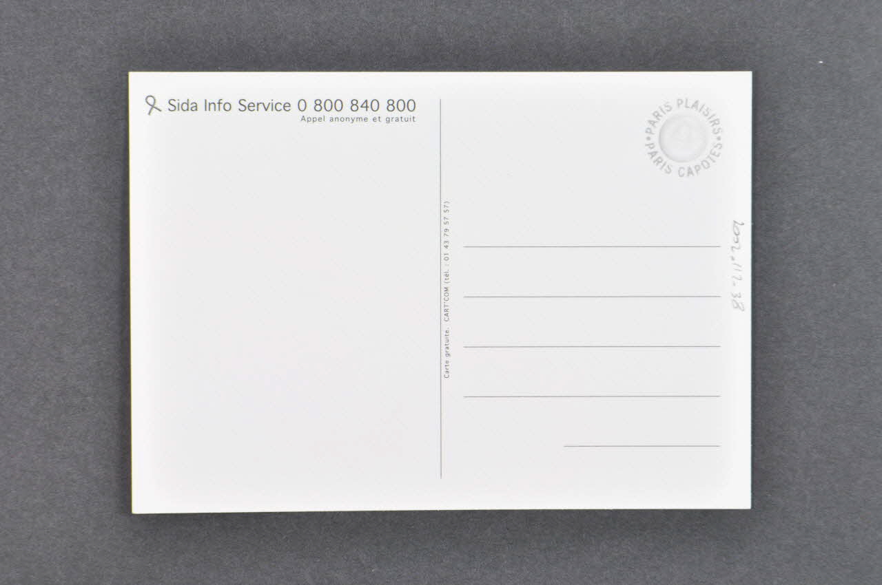 Sida Info Service 0 800 840 800 / Appel anonyme et gratuit (Numéro de téléphone inscrit en noir, en haut de la moitié gauche du dos de la carte.), versoPARIS PLAISIR / PARIS CAPOTES (Logo imprimé dans l'angle inférieur droit de la face avant de la carte. Il est formé d'un cercle d'inscriptions blanches entourant une image de préservatif jaune. // Ce logo est repris en gris, au dos, à l'emplacement du timbre, en haut, à droite.), rectoMAIRIE DE PARIS (Logo de la mairie de Paris, imprimé en bas, à gauche, sur la face avant de la carte. Il est formé d'un rectangle bleu avec une zone rouge à droite, séparée par un bateau stylisé blanc. Une inscription est présente en lettre capitales blanches sur le fond bleu.), rectoCarte gratuite. CART'COM (tél. : 01 43 79 57 57) (Petite inscription disposée à la verticale, au dos de la carte, au milieu.), versoDécor