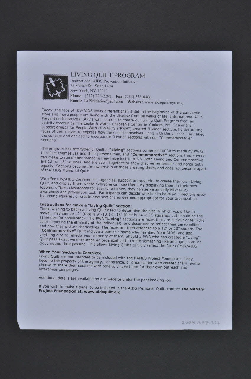 LIVING QUILT PROGRAM // International AIDS Prevention Initiative // 75 Varick Street, Suite 1404 (c/o DC 1707) // New York, NY 10013 // www.aidsquilt-nyc.org // IAPInitiative@aol.com (en haut), versoTitre
