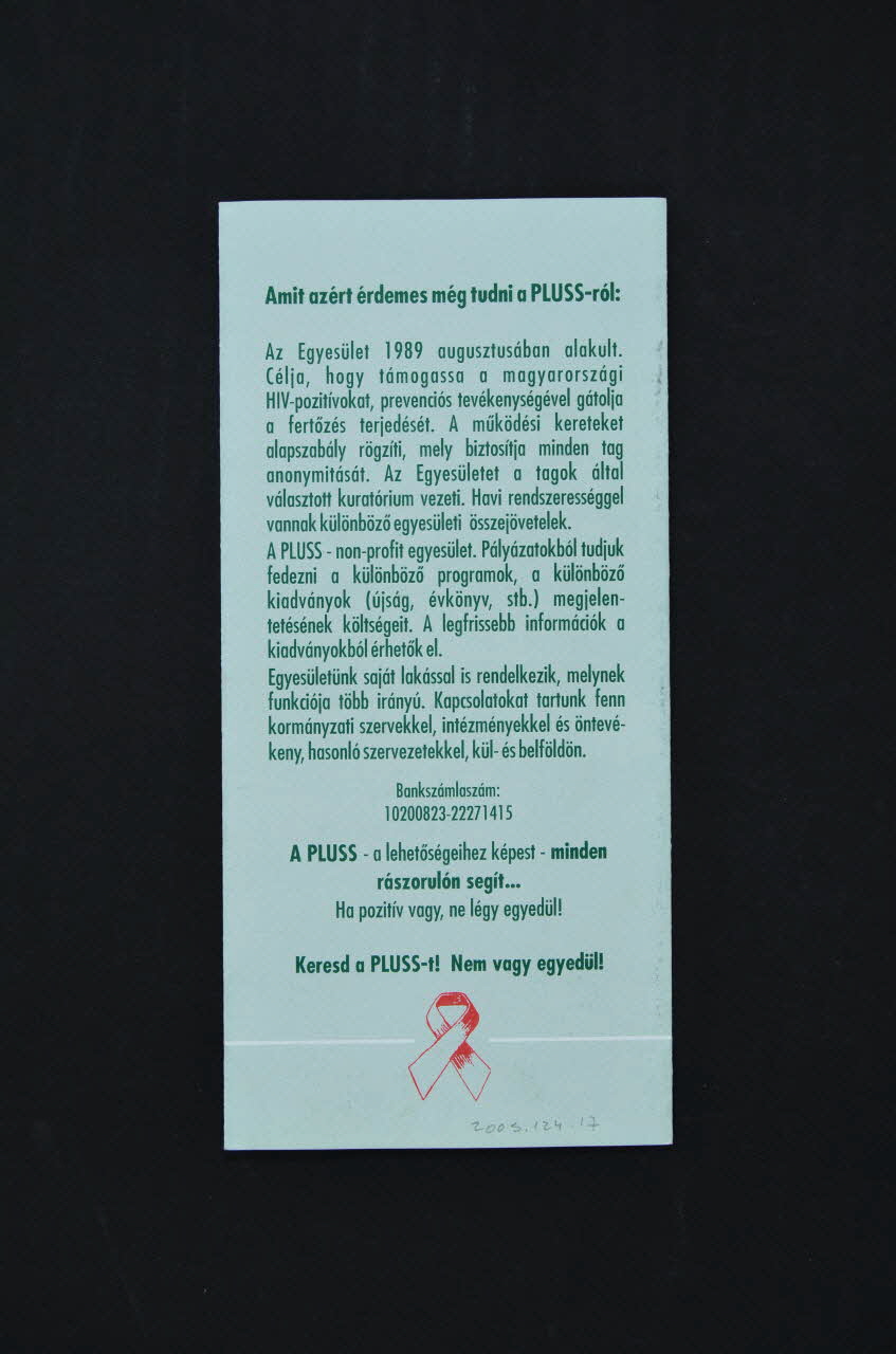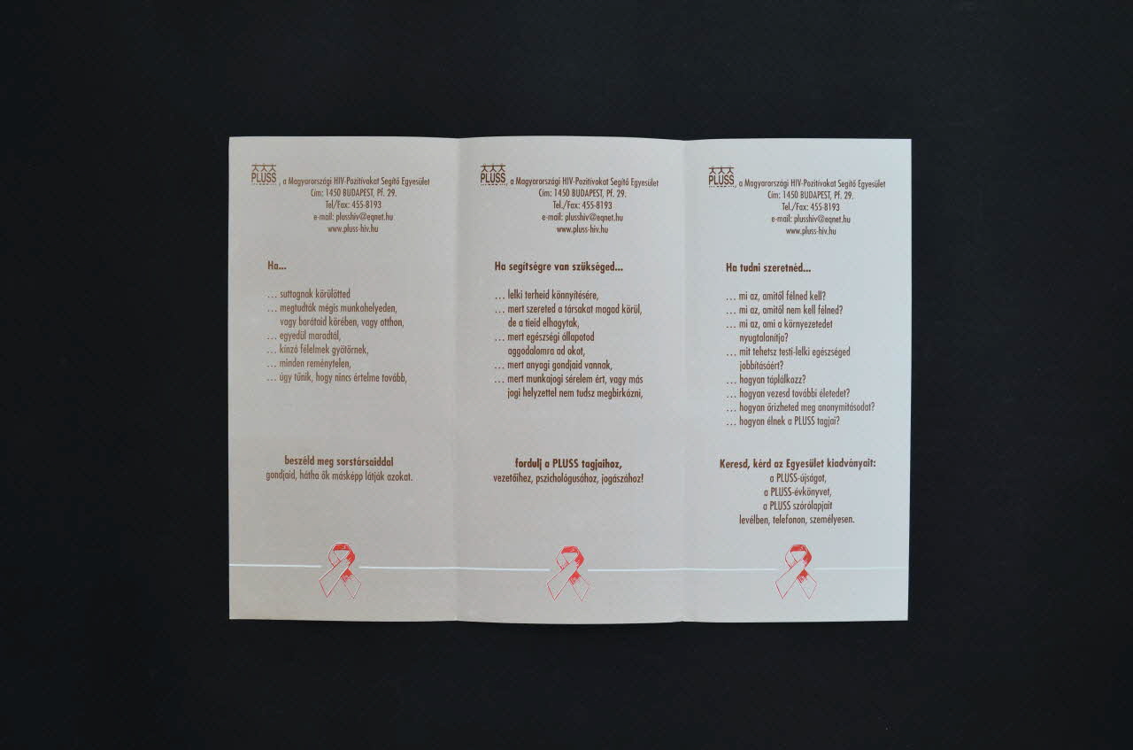 Ha.... // beszéld meg sorstarsaiddal // Ha segitségre van szükséged... // fordulj a PLUSS tagjaihoz // Ha tudni szeretned... // Keresd, kerd az Egyesület kiadvanyait: (L'inscription est marquée en caractères marron foncés.), à l'intérieurLogo, nom de société