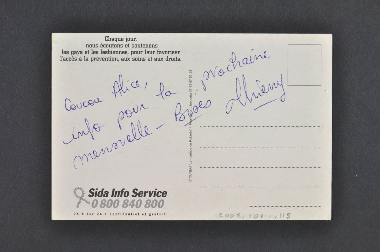 Chaque jour, // nous écoutons et soutenons // les gays et les lesbiennes, pour leur favoriser // l'accès à la prévention, aux soins et aux droits. (Imprimé en noir sur blanc, dans l'angle supérieur gauche), versoCoucou Alice, // info pour la prochaine mensuelle - Bises // Thierry (Texte écrit à la main au stylo bleu, en diagonale), versoSignature
