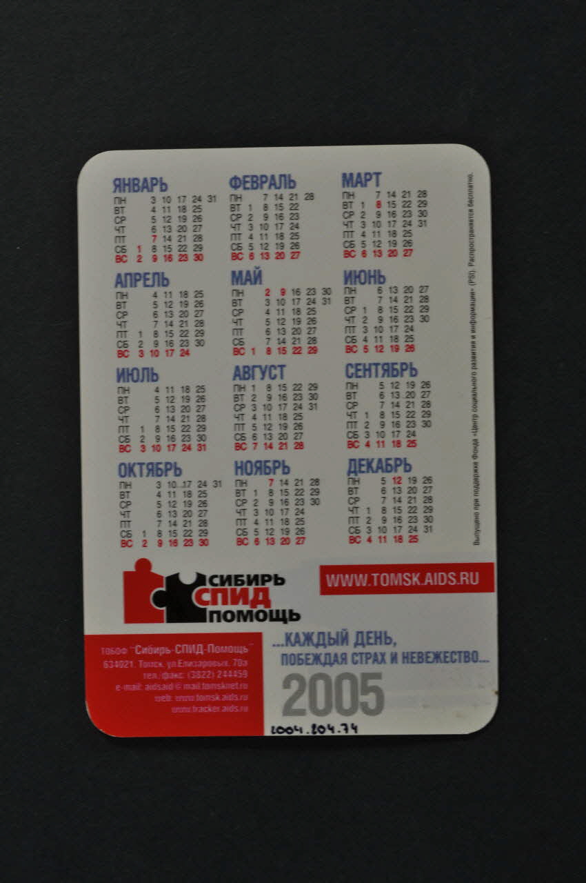 www.tracker.aids.ru (angle inférieur gauche, sur un cadre rouge.), versoWWW.TOMSK.AIDS.RU (vers l'angle inférieur droit, sur un bandeau rouge), versoDécor