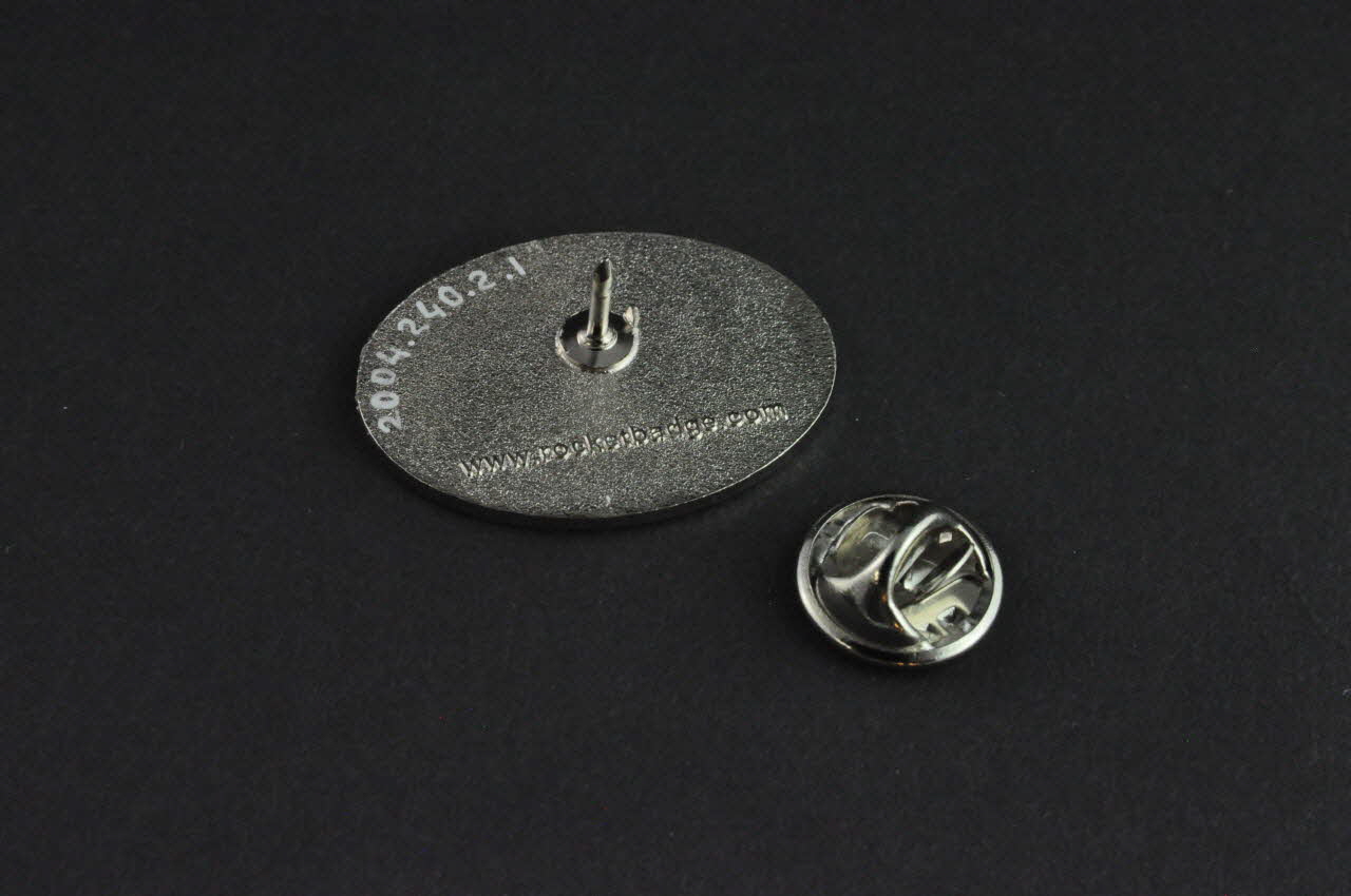 Métal moulé émaillé. / Pin's ovale, en métal argenté, émaillé. Au centre, deux silhouettes bleues entourent un petit ruban rouge. Il s'agit ici du logo de la coalition "The global coalition on women and AIDS".Décor