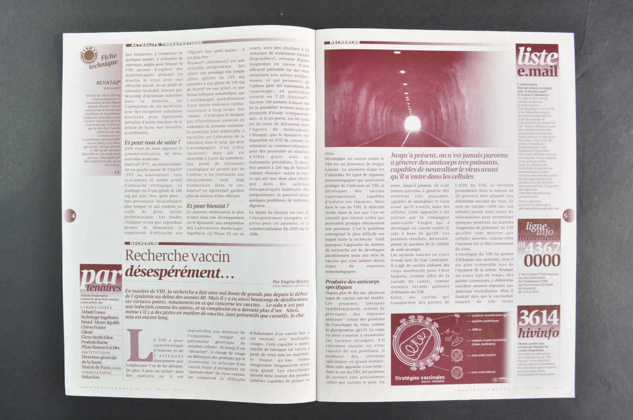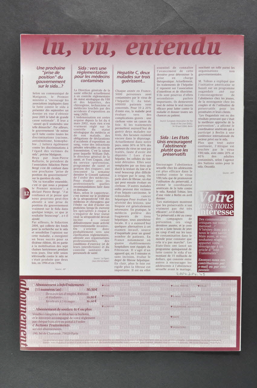 p. 1 En haut, sur bandeau brun, en caractères bruns surlignés de blanc, nom de la revue : " Infotraitements" avec au dessus :"Infotraitements est une publication de l'association ActionsTraitements" / n°124 / Information Soutien support" et au dessous : "mensuel d'information sur les traitements du VIH/Sida et des co-infections, mai 2004, n° 124". En dessous : "Editorial" et, en grosses italiques brunes :"Réinventer la prévention" et en petits caractères : par Odile Vergnoux (avec en sous impression photos de préservatifs et tubes de lubrifiants) : l'espoir des microbicides. Vericalement, à gauche, le sommaire.