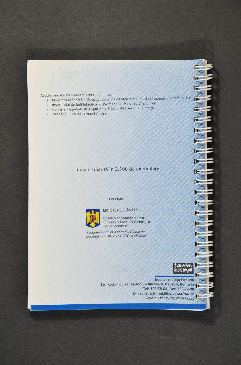 IMPLEMENTATOR : FUNDATIA ROMANIAN ANGEL APPEAL // IN COLABORARE CU MINISTERUL SANATATII (Dans la partie supérieure, en capitales noires), sur la couvertureAdresse, nom d'association