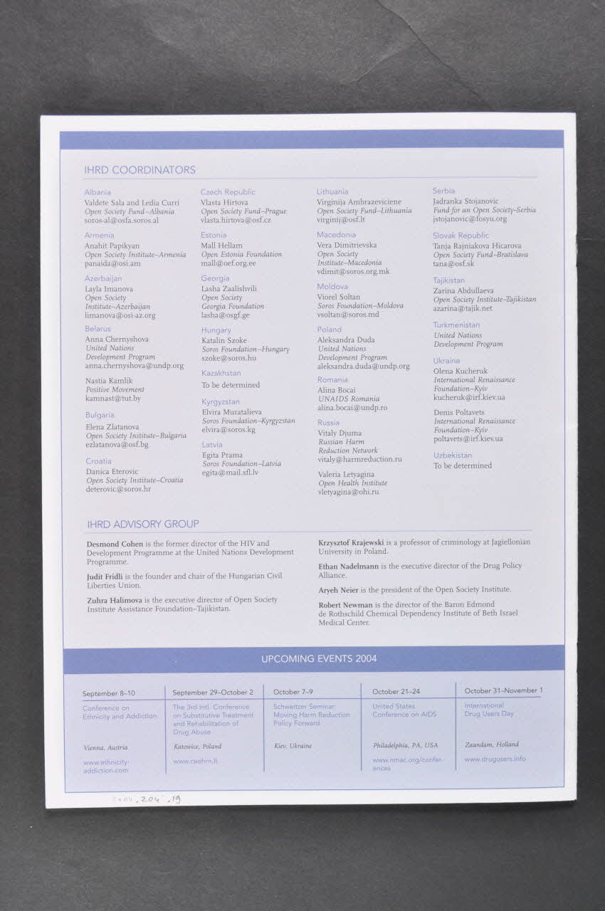 Dernière page : liste des correspondants de l'Open Society en Albanie, Arménie, Azerbaijan, Bielorussie, Bulgarie, Croatie, République Tchèque, Estonie, Géorgie, Hongrie, Kazakhstan, Kyrgyzstan, Lettonie, Lituanie, Macédoine, Moldavie, Pologne, Roumanie, Russie, Serbie, Slovaquie, Tajikistan, Turkhménistan, Ukraine, Uzbékistan.