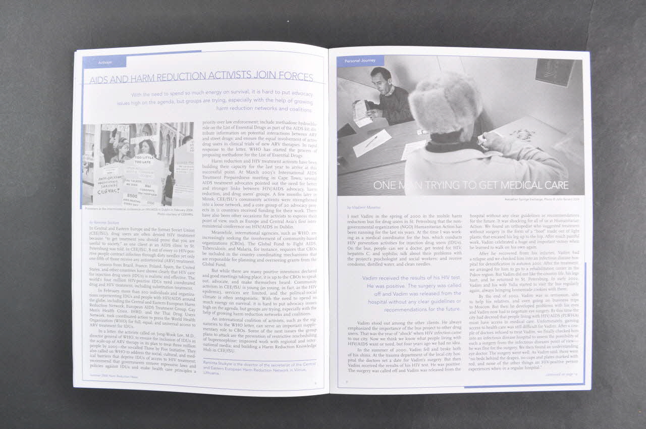 Au dessus, en tout petits caractères bleus, en anglais : Feuille d'information du programme international de développement de la réduction des risques de l'Open Society Institute, été 2004, volume 5, n° 2