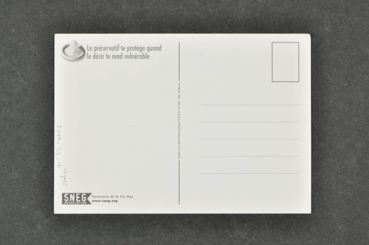 SNEG // ASSOCIATION // // Partenaire de la Vie Gay // www.sneg.org (Imprimé en blanc, dans l'angle inférieur gauche au recto // Et imprimé en noir dans l'angle inférieur gauche, au verso), en basDécor