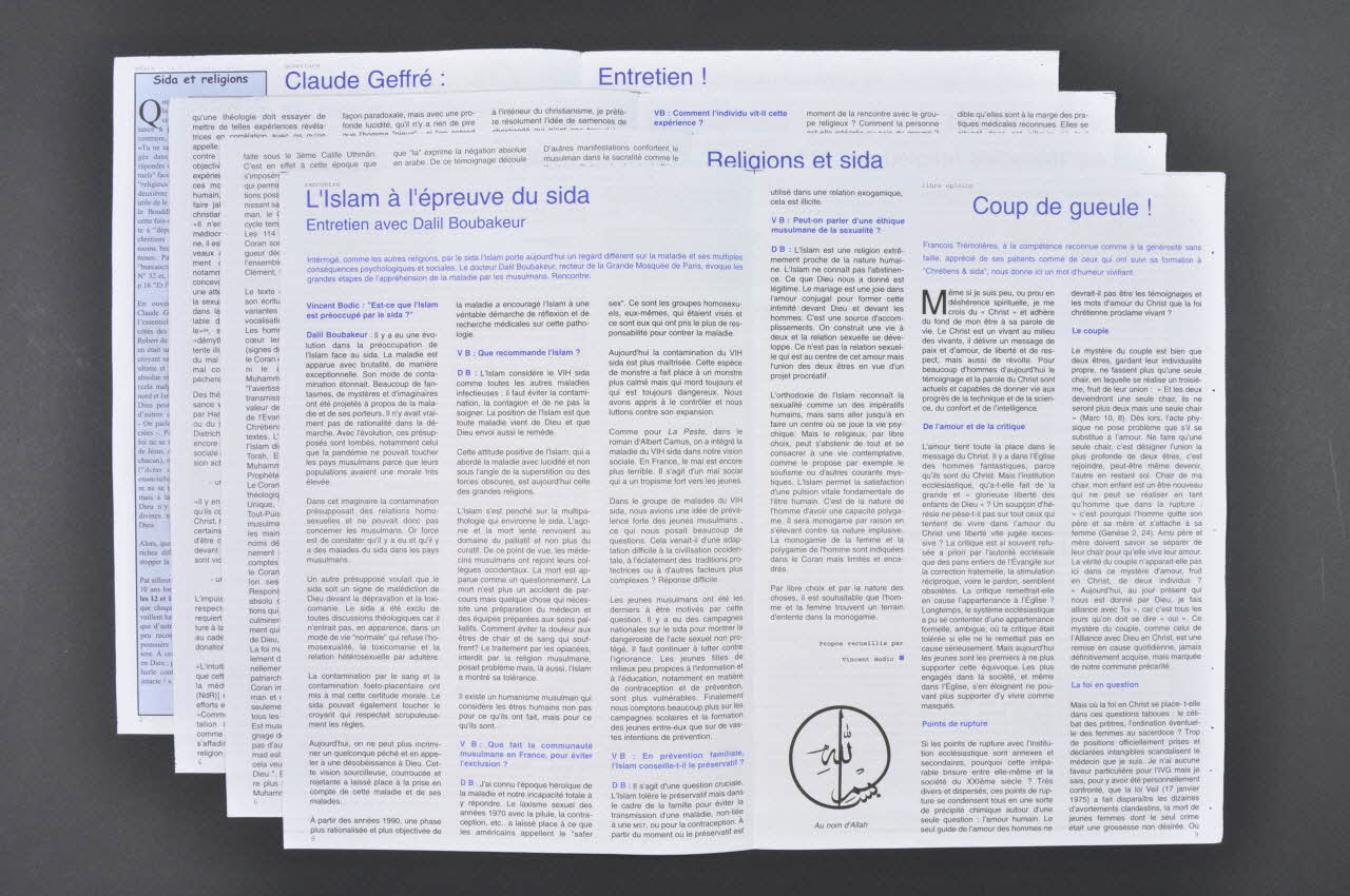 édito // Religions face au sida // Luc Nollet // // ouverture // Au risque du dialogue // Claude Geffré // // rencontre // Islam & sida // Recteur Dalil Boubakeur // // recherche // Religions et thérapies aujourd'hui // Anne-Cécile Bégot (En première page)Date