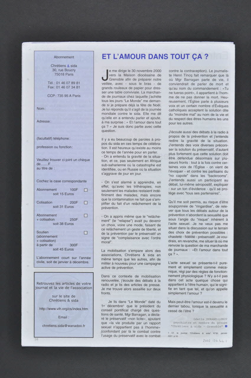 De : Lieu : FranceDate : 1 avril 2001Donne des nouvelles de l’association et informe sur les évènements et débats dans une optique chrétienne : ici, en particulier, le rapport des différentes religions avec le sida, dont l’Islam.