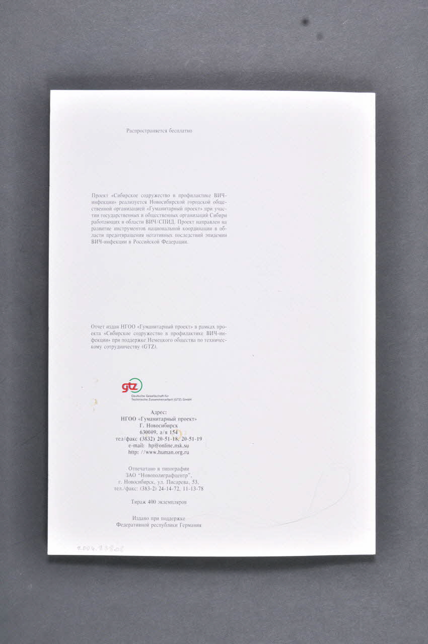 La couverture, sur fond blanc, présente en haut, un texte en caractères cyrilliques noirs puis au centre, sur fond bleu, une carte de Sibérie avec des petits rubans rouges. En bas, se trouvent des logos associatifs. Le dos, sur fond blanc, se compose d'inscriptions en caractères cyrilliques noirs, notamment d'informations relatives à la conception de cette brochure. L'intérieur présente sur fond blanc des textes sur deux colonnes en caractères noirs, certains intégrés à des tableaux sur fond bleu.Décor