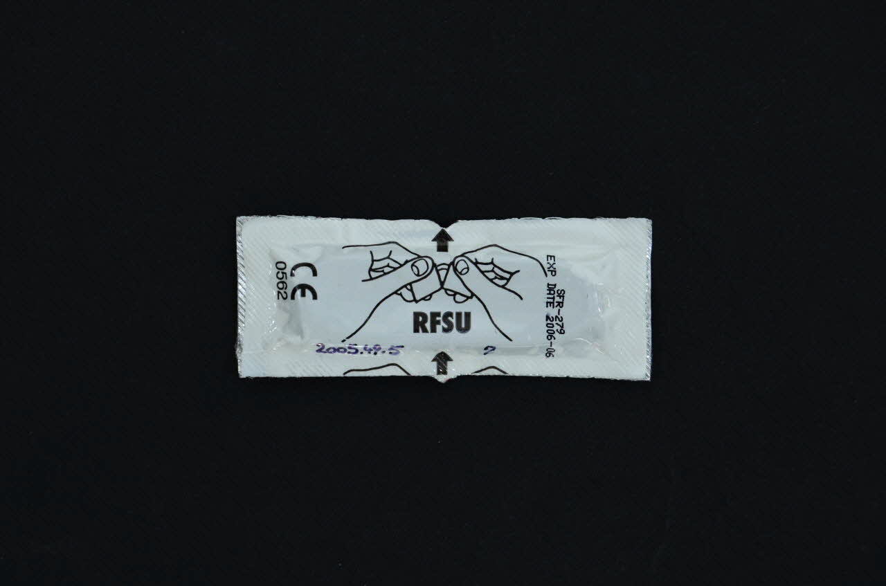 De forme rectangulaire, l'étui du préservatif est en matière plastique blanche aux bords thermo-collés. Au recto sont imprimées deux fraises en noir et rouge et une inscription blanche. Au verso figurent un schéma en noir expliquant l'ouverture de l'étui et des inscriptions noires.Décor