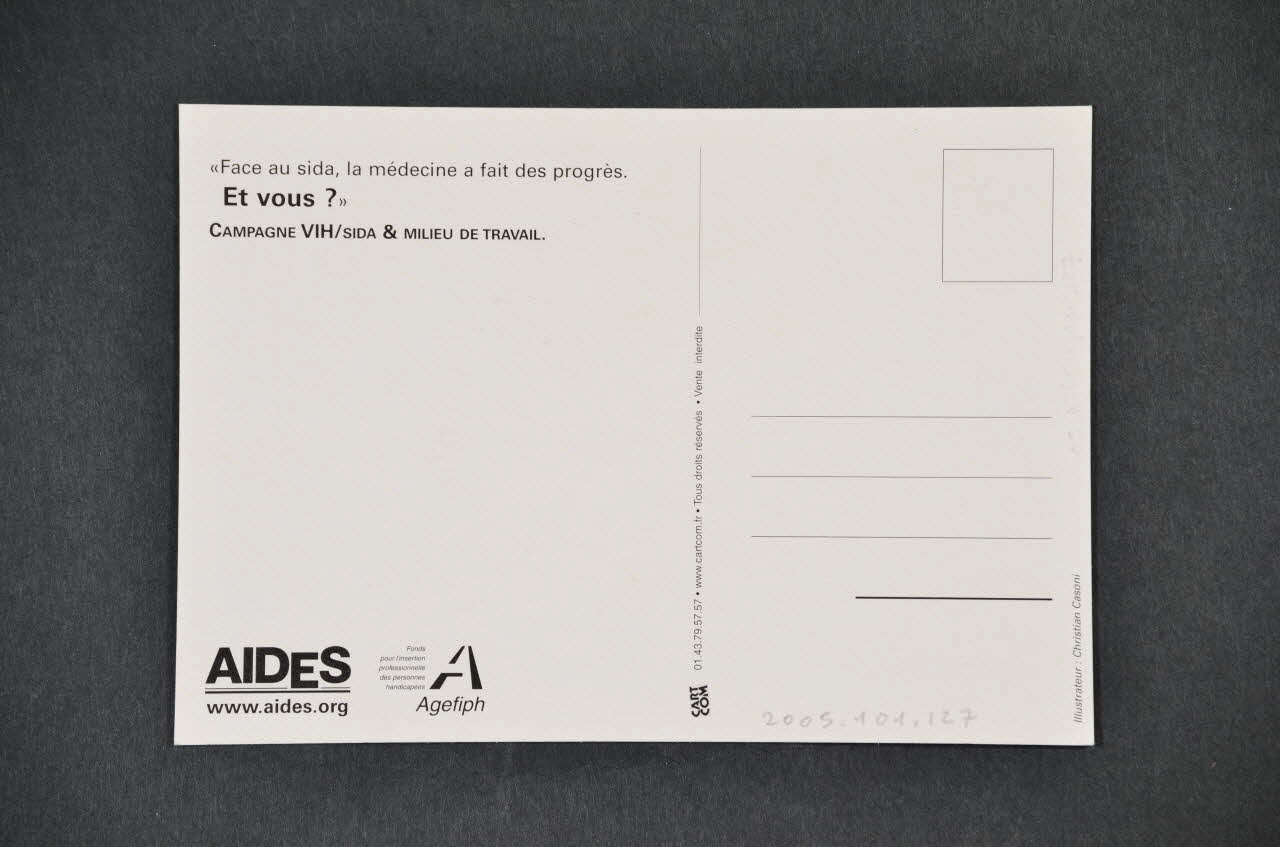 "LA SAVON N'A JAMAIS // TRANSMIS LE VIRUS // DU SIDA !" (Imprimé en capitales noires dans la partie supérieure droite (faute "LA" à la place de "LE")), recto"Face au sida, la médecine a fait des progrès. // Et vous ?" // CAMPAGNE VIH/SIDA & MILIEU DE TRAVAIL. (Imprimé en noir sur blanc dans l'angle supérieur gauche), versoLogo