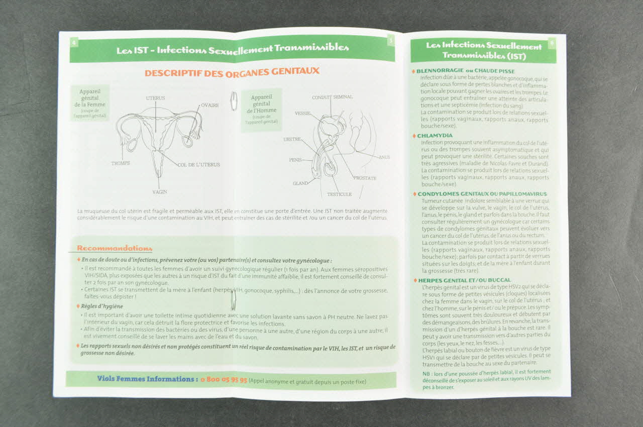 s'informer 2 // // Les femmes sont plus vulnérables au VIH que les hommes lors de rapports sexuels non protégés. Cette vulnérabilité est due à différents aspects: // // Biologiques [...] 2 // Socioculturelles [...] 2 // // Risques de contamination par le VIH 3 // Risque zéro de transmission du VIH: [...] 3 // Risques de contamination sexuelle (sans préservatif) et / ou sanguine [...] 3 // Risques de transmission de la mère à l'enfant [...] 3 // // Risques de contamination par le VHC (virus de l'hépatite C) // Risques de contamination sanguine: [...] 3 // Risques de contamination sexuelle: [...] 3 // Risque de transmission materno-foetale (de la mère à l'enfant) possible. [...] 3 // // // Les IST - Infections Sexuellement Transmissibles // Descriptif des organes génitaux [...] 4 // Recommendations [...] 4 // // Les Infections Sexuellement Transmissibles (IST) // BLENNORRAGIE ou CHAUDE PISSE [...] 6 // CHLAMYDIA [...] 6 // HERPES GENITAL ET/OU BUCCAL [...] 6 SYPHILIS [...] 7 // VHA (Virus de l'Hépatite A) [...] 7 // VHB (Virus de l'Hépatite B) [...] 7 // // Se dépister [...] 8 // // Se protéger [...] 9 // LE PRESERVATIF FEMININ: le Fémidom® 9 // LES PRESERVATIFS MASCULINS 10 // // Le Kiosque Infos Sida Toxicomanie 11 (Titres et sous-titres imprimés en blanc et rouge), à l'intérieurTexte