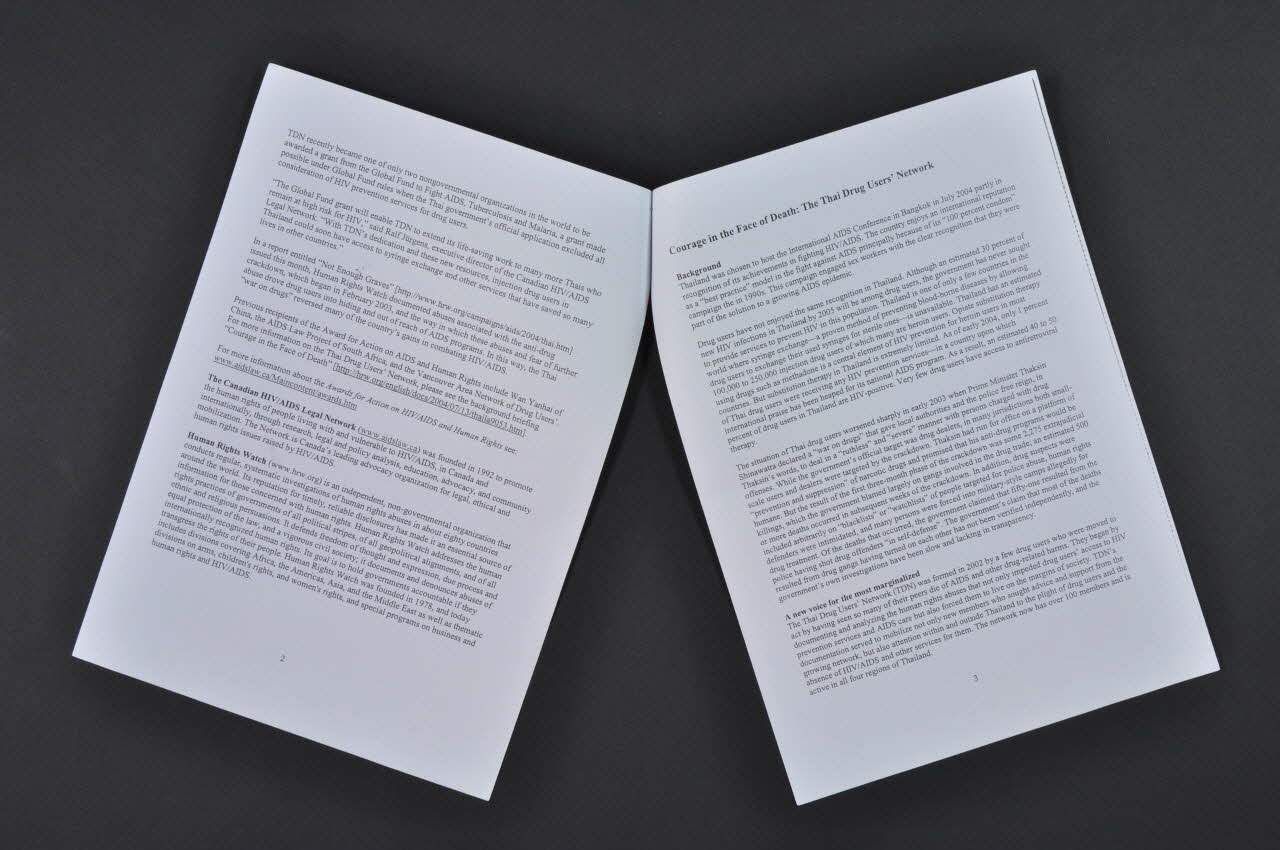 Thailand : Thai AIDS Pioneers Honored // Drug User's Network Faces Down Government Crackdown // // The Canadian HIV/AIDS Legal Network // // Human Right Watch // // Courage in the Face of Death: The Thai Drug User's Network // // Background // // A nex voice for the most marginalized (Sous-titres en caractères gras), à l'intérieurDécor