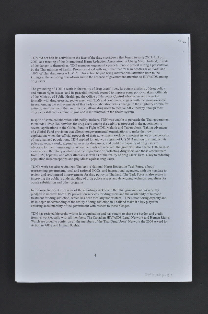 Remise du Prix pour des actions relatives au sida et aux droits de l'homme au "Thai Drug User's Network" par "Human Rights Watch" et "Canadian HIV/Aids Legal Network". En Thailande, exclusion des usagers de drogue de la politique publique de prévention qui est pourtant vantée. Beaucoup d'usagers de drogue sont séropositifs et n'ont pas accès aux traitements. En 2002, le premier Ministre Thaksin déclare la guerre aux usagers de drogues. Environ 2.275 meurtres. Le Thai drug users Network a été créé en 2002