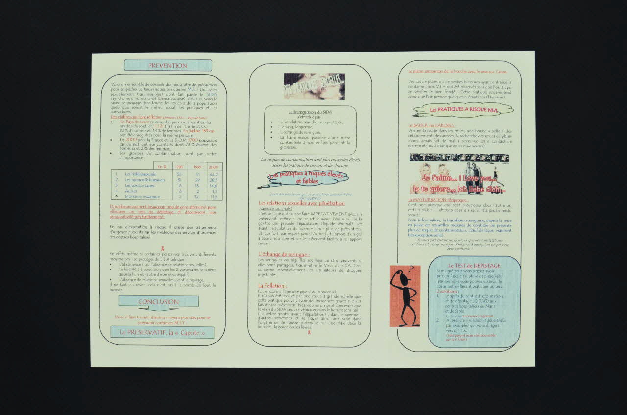 Des pratiques sexuelles [...] // Moyens de transmission du sida [...] // Pratiques à risque élevé ou faible : Les relations sexuelles avec pénétration (vaginale ou anale) [...] // L'échange de seringues [...] // La fellation [...] // Le plaisir amoureux de la bouche avec le sexe ou l'anus [...] // Pratiques à risque nul : Le baiser, les caresses [...] // La masturbation réciproque [...] // La transfusion sanguine, depuis la mise en place de nouvelles mesures de contrôle, ne présente plus de risques de contamination (sauf de façon vraiment très exceptionnelle)" [...] (feuillet 2 et 3), à l'intérieur[...] // Des chiffres qui font réfléchir // [...] // Et malheureusement, beaucoup trop de gens attendent pour effectuer un test de dépistage et découvrent leur séropositivité très tardivement. // En cas d'exposition au risque, il existe des traitements d'urgence prescrits par les médecins des services d'urgence des centres hospitaliers // [...] // L'abstinence... la fidélité...l'absence de relations sexuelles avant le mariage... Il ne faut pas rêver, ce n'est pas à la portée de tout le monde... // CONCLUSION (premier feuillet), à l'intérieurle test de dépistage, où le faire ? [...] // // Les résultats [...] // // Séronégatif, mais le test ne vous protège pas [...] // // Séropositif, mais les traitements médicaux qui vous seront donnés ne vous guériront pas de votre séropositivité." [...] // // Pour votre plaisir, pour votre santé, continuez d'utiliser le préservatif !" [...] (feuillet 3 et 4), à l'intérieurSous-titre