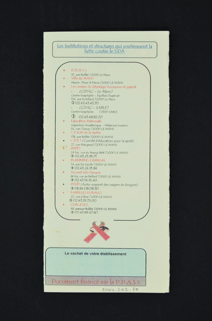 Au recto. Les institutions et structures qui soutiennent la lutte contre le SIDA" En dessous, en noir et rouge, dans un encadrement noir, nom et coordonnées de : DDASS / Ville du Mans / Centres de dépistage anonyme et gratuit Le Mans et Sablé / Education Nationale, médecine scolaire / CPAM de la Sarthe / Comité d'éducation pour la santé, Le Mans / AIDES, Le Mans / Planning Familial, Le Mans / Accueil Info Drogue / ASUD / Familles Rurales / Clin d'oeil. En bas, petit ruban rouge / espace libre "le cachet de votre établissement" Document financé par la DDASS.