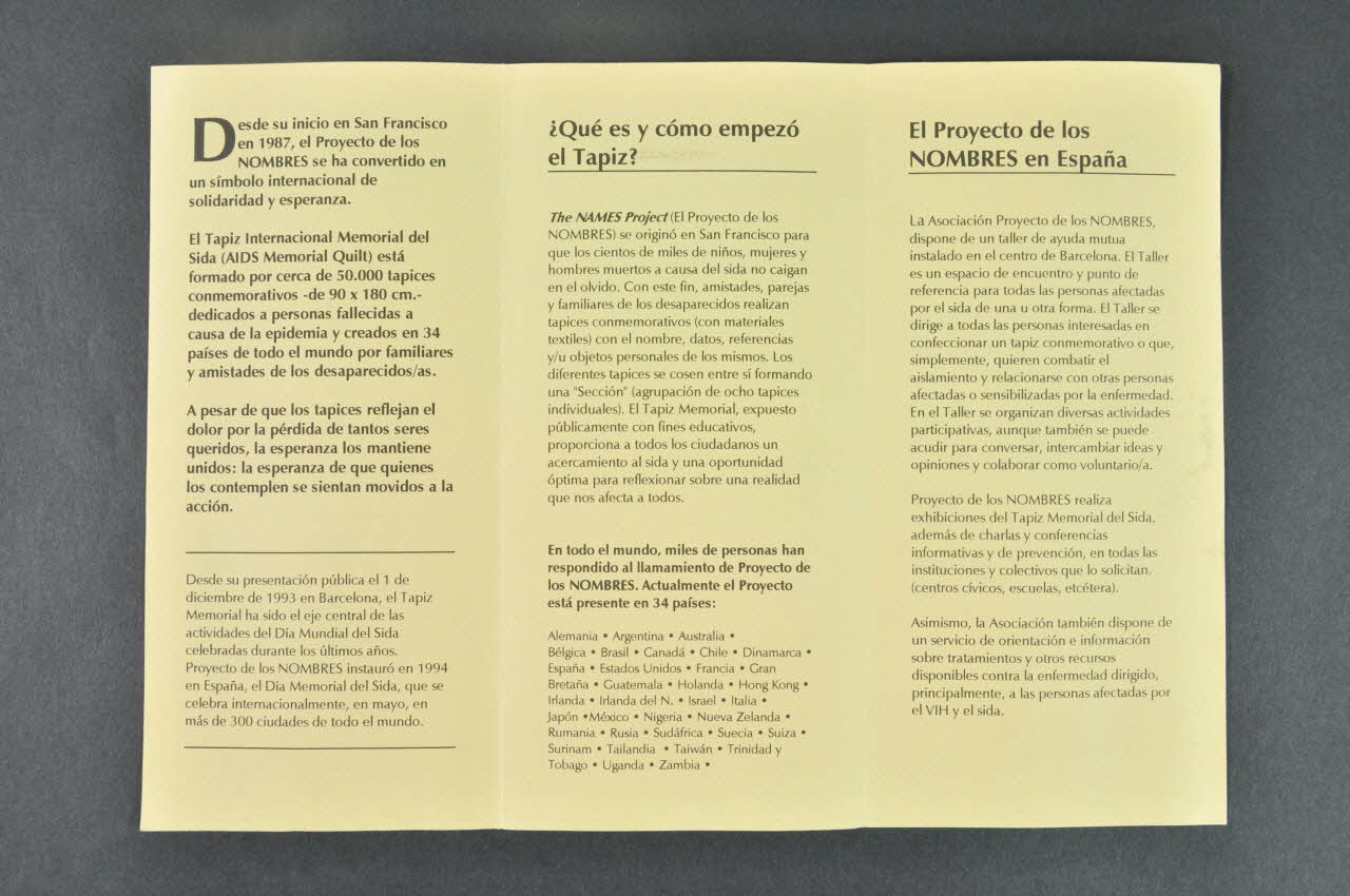 Feuillet 1. Ce qu'est le Quilt International. Expression de la douleur de la perte d'être chéris, de l'espérance de rester unis, et que ceux qui les voient se tournent vers l'action. Première présentation publique le 1er décembre 1993 à Barcelone. 1ère journée Mémoriale du sida en Espagne en 1994. Feuillet 2. Ce qu'est le Quilt. Pays dans lesquels il est présent : Allemagne, Argentine, Australie, Belgique, Brésil, Canada, Chili, Danemark, Espagne, Etats Unis, France, Grande Bretagne, Guatémala, Hollande, Hong Kong, Irlande, Irlande du Nord, Israel, Italie, Japon, Mexique, Nigéria, Nouvelle Zélande, Roumanie, Russie, Afrique du Sud, Suède, Suisse, Surinam, Thailande, Taiwan, Trinidad et Tobago, Uganda, Zambie. Feuillet 3. Le projet des noms en Espagne. Atelier à Barcelone. Mais aussi lieu d'écoute, information et prévention, service d'orientation et d'information sur les traitements. Feuillet 4. Atelier d'aide mutuelle pour la confection des panneaux / Centre d'information sur les traitements. "Le projet des Noms permet, à travers le Quilt, d'illustrer l'ampleur de l'épidémie, de perpétuer la mémoire des personnes disparues, d'éduquer, faire prendre conscience et prévenir les citoyens sur la maladie, lutter contre la discrimination et la marginalisation. Dos : "Que peux-tu faire contre le sida ? Se protéger / S'engager / Faire un panneau commémoratif / Etre volontaire ou associé au Projet des Noms