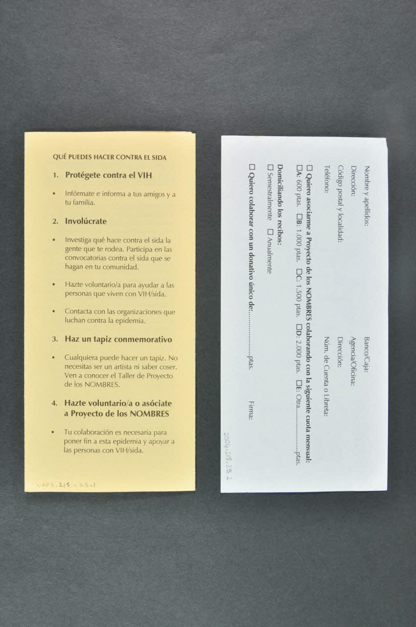 Elle est de forme rectangulaire, imprimée en noir sur fond jaune et se lit dans le sens vertical. Ce dépliant est accompagné d'une feuille blanche (2004.215.23.2), imprimée en noir, rectangulaire, qui se lit à l'horizontal. Ils sont écrits en espagnol. Sur le dépliant: Au recto, en haut figure n logo avec un coeur traversé d'une aiguille à coudre, en partie basse une photo de cinq mains en train de coudre une couverture. En dessous, se trouve des coordonnées. A l'intérieur, sont présents du texte écrit petits caractères noirs, et deux titres en plus gros caractères sur les feuillets deux et trois. Au verso, figure du texte écrit petits caractères noirs. Sur la feuille: Au recto, sont présents un logo, un texte et une adresse. Au verso, figure un buletin d'identification pour faire un don.Inscriptions