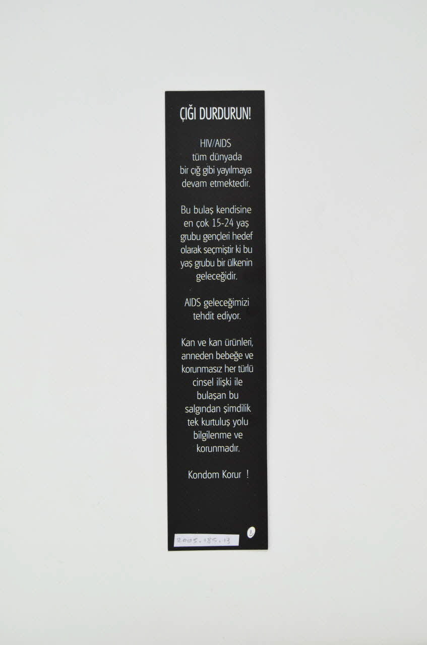 CIGI Durdurun ! // HIV/AIDS tüm dünyada bir cig gibi yayilmaya devam etmektedir. // Bu bulas kendissine en çok 15-24 yas grubu gençleri hedef olarak seçmistir ki bu yas grubu bir ülkenin gelecegidir. // AIDS gelecegimizi tehdit ediyor. // Kan ve kan ürünleri, anneden bebege ve korunmasiz her türlü cinsel iliski ile bulasan bu salgindan simdilikk tek kurtulus yolu bilgilenme ve korunmadir. // Kondom Korur ! (au milieu), versoAdresse