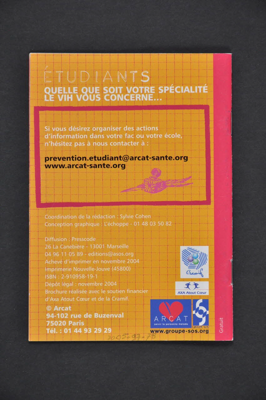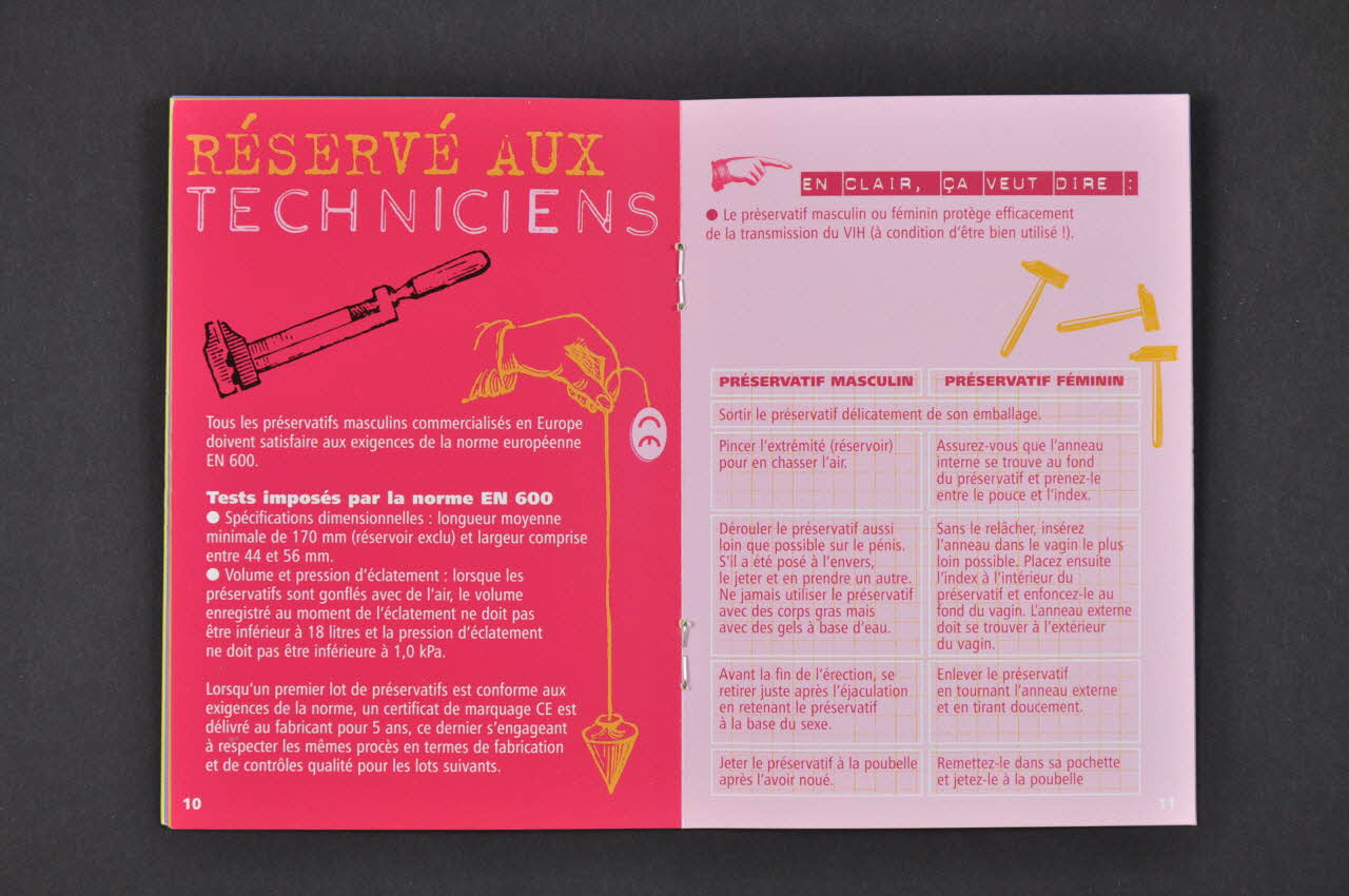 p.2-3. "Réservé aux linguistes" (définitions, modes de transmission) et en rouge :"Aujourd'hui; "sida" est devenu un nom commun, cela doit nous rappeler que nous sommes tous concernés" p.4-5. Réservé aux spécialistes des langues " (texte épidémiologique en anglais, données épidémiologiques) et en rouge :"Permettre à chacun de se protéger contre le virus et rendre accessible à tous les traitements sont deux des plus grands défis que l'humanité doit relever aujourd'hui" p.6-7. Réservé aux scientifiques " (texte scientifique et schéma sur le cycle du VIH) et en rose :"Nous ne savons toujours pas éradiquer le virus ni guérir la maladie. Continuons à nous protéger !'" p.8-9. Réservé aux sociologues " (modes de transmission et dépistage) et en rouge :"Il n'y a pas de groupes à risque mais des comportements à risque'" p.10-11. Réservé aux techniciens " (normes pour les préservatifs et mode d'emploi préservatif masculin et féminin) p.12-13. Réservé aux juristes " (code du travail sur embauche et licenciement) et en rouge :"La stigmatisation et la discrimination entravent les efforts visant à maîtriser l'épidémie mondiale et créent un climat idéal pour sa propagation'" p.14-15. Réservé aux étudiants en médecine " (Infections Sexuellement Transmissibles les plus fréquentes) et en jaune :"L'utilisation du préservatif protège du VIH et de la plupart des IST !'" p.16-17. Réservé à tous " (dépistage et CDAG, traitement d'urgence) et en blanc :"Que tu sois juriste, linguiste, scientifique, technicien, sociologue, étudiant en médecine, spécialiste des langues... tu n'en es pas moins homme. Amoureux transi ou bombe sexuelle, en tant que citoyen, tu ne peux ignorer que personne n'est à l'abri d'une prise de risque. Et n'oublie pas que la consommation d'alcool ou de drogues peut diminuer la vigilance au risque..."' p.18-19. Pour en savoir plus, pour en parler " (adresses utiles : téléphones, sites internet"