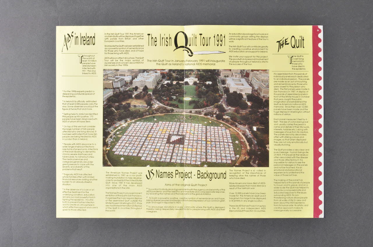 Verticalement, à gauche, données sur le sida en Irlande / Présentation du projet du Quilt Tour : déploiement de panneaux irlandais et aussi américains, anglais et d'autres pays d'Europe. En bas, et verticalement à droite, présentation du names project américain.