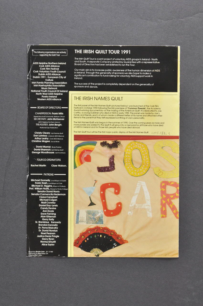 Cette photographie se prolonge au revers. Au dessus, en petits caractères noirs, on trouve un texte de présentation du "Quilt" irlandais. On y apprend que le panneau photographié est le premier panneau du Quilt. Il date de 1990, est dédié à Joe Carthy, jeune habitant de Dublin décédé du sida début 1990. Chacun des amis ou des membres de sa familleconfectionnèrent une lettre et ajoutèrent des objets. en haut et verticalement à gauche, bandeau noir, inscriptions en blanc. En haut, présentation du "tour": premier grand déploiement du Quilt en Irlande, projet interassociatif. Verticalement le liste des personnes et associations soutenant le "Quilt Tour".