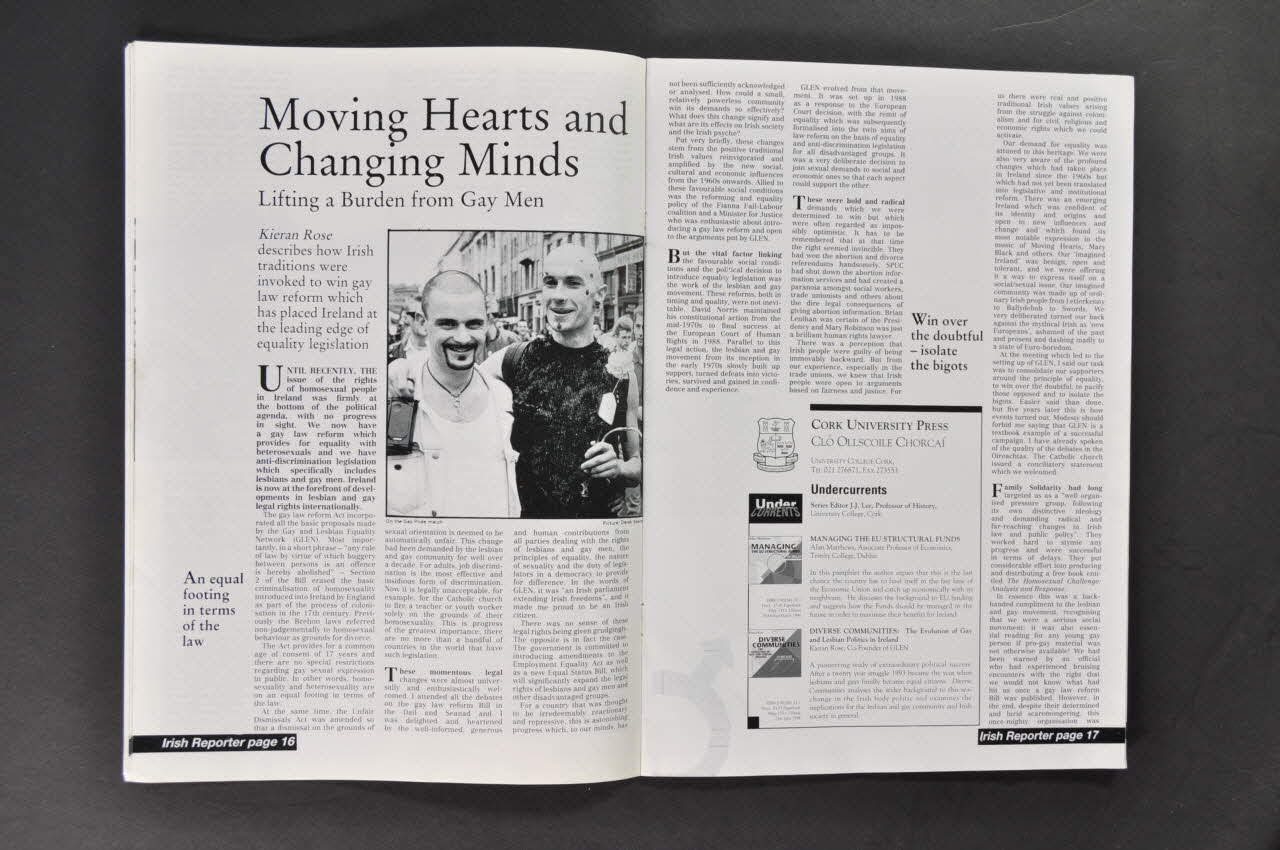 Sommaire traduit et partielement commenté: - p.3 Changements dans les rôles masculin féminin - p.5 A propos de la violence domestique - p.9 Réflexions sur des mouvements masculins - p.11 Les détenus républicains : la vie sous les stéréotypes - p.12 Loyalisme et culture "macho" - p.14 Situation politique et atmosphère masculine dans le RUC (Royal Ulster Constabulary) - p.16 Historique du combat pour la loi sur l'homosexualité qui donne aux gays l'égalité avec les hétérosexuels avec la loi antidiscrimination. Dans le texte, rien sur le sida mais photo des responsables de l'association à la Gay pride devant une banderole sur laquelle est écrit "AIDS" - p.20 Interview de la première sage femme homme - p.22 Les prêtres, la masturbation et la confession - p.24 Le mâme irlandais au cinéma - p.26 Sexe et violence : image des hommes dans les romans sur la guerre civile - p.29 Pornographie et censure - p.31 Sport et machisme