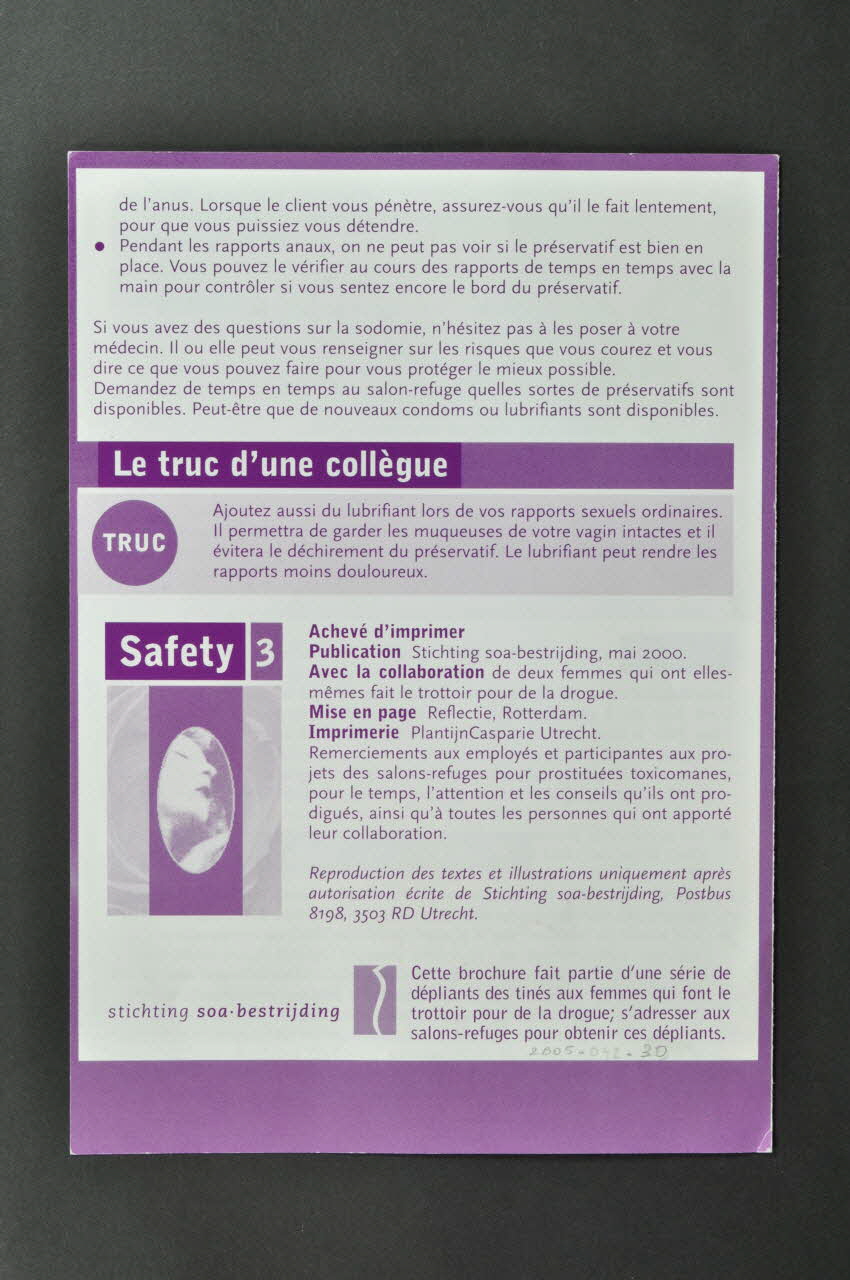- En page 4 : "Cette brochure fait partie d'une série de dépliants destinés aux femmes qui font le trottoir pour de la drogue" // - p.2 Fellations : "La plupart des clients acceptent que la pénétration vaginale se fasse avec un condom, mais veulent des fellations sans préservatifs ... Or, si une pipe sans éjaculation dans la bouche ne comporte qu'un risque réduit de transmission du virus HIV, elle peut être à l'origine d'autres maladies sexuellement transmissibles." // - Fellations sans éjaculation dans la bouche. // - Fellations avec éjaculation dans la bouche // - Les trucs de collègues (encart sur fond violet pâle) // - Sexe anal (au fil du dépliant)Décor