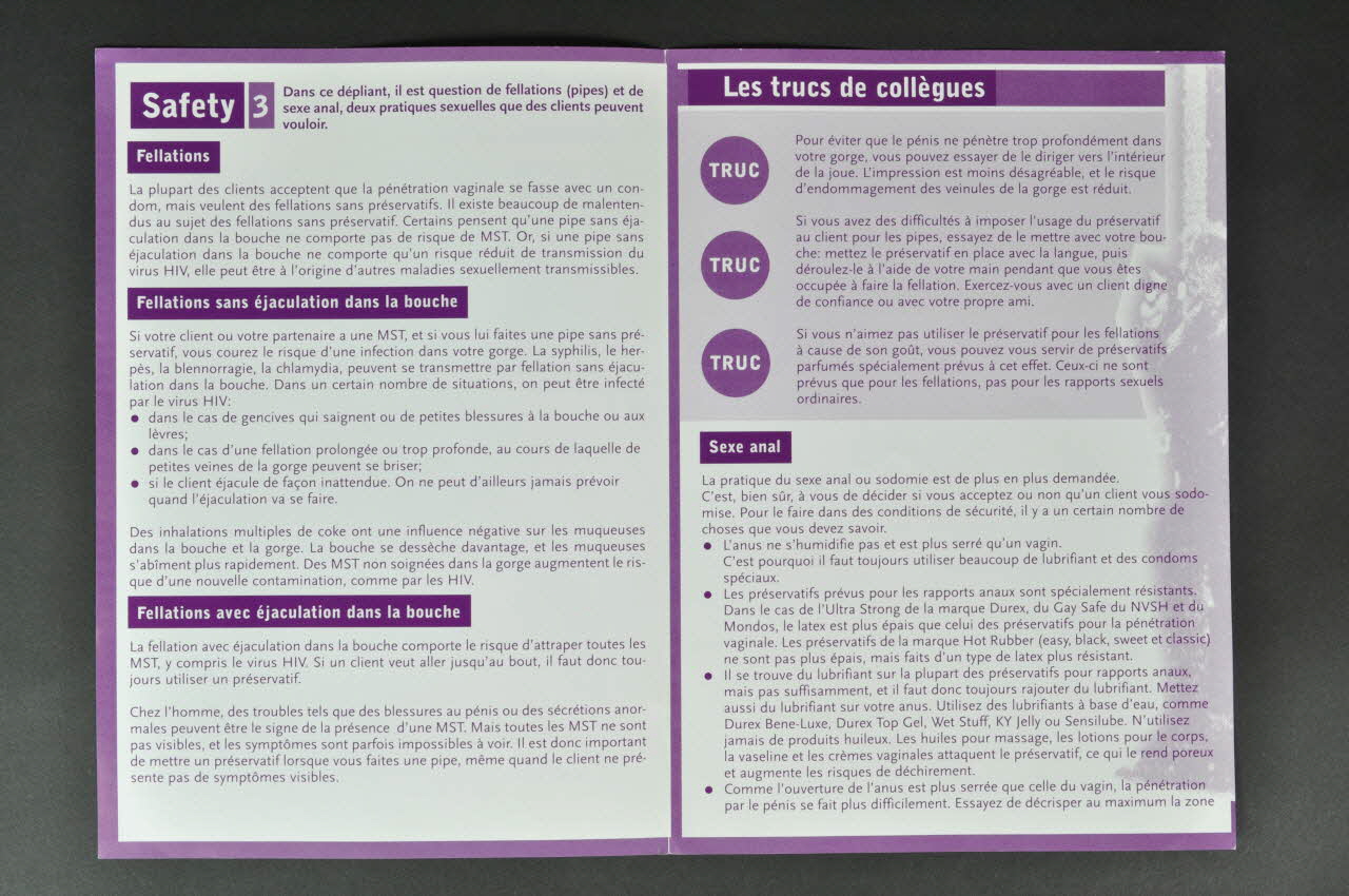 Dépliant, "Safety 3. Fellations (pipes) et sexe anale" (en français, orthographe respectée)