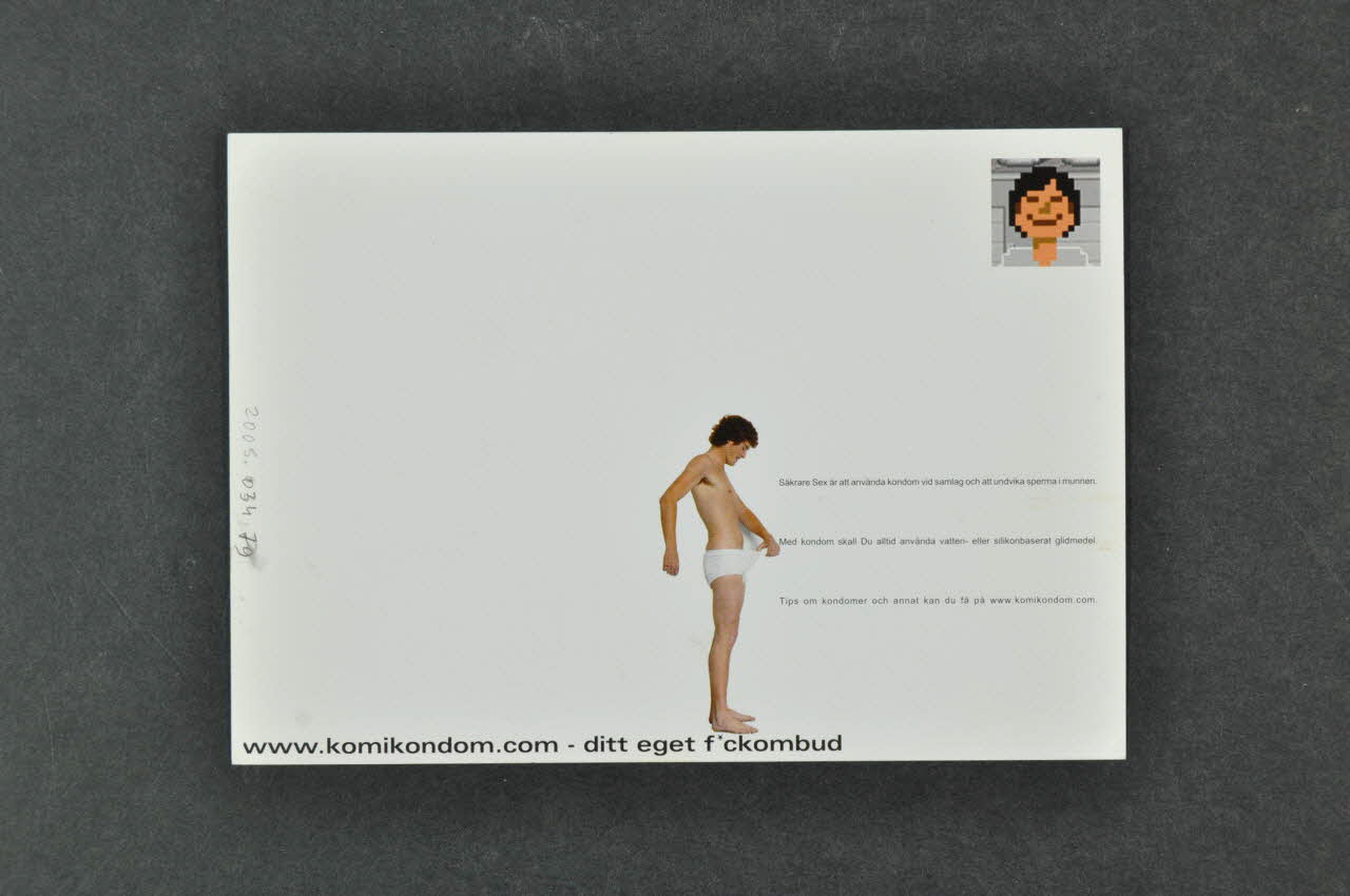 Au recto on peut voir sur fond blanc une photographie d'un jeune homme regardant dans son slip. Un bandeau rouge avec une adresse internet coupe la carte en deux. En haut à gauche il y a un texte qui légende ce qu'il y a dans le slip. En bas il y a le logo de l'association. Au verso la carte est vierge. En bas, l'adresse et le slogan du recto sont repris. A l'emplacement du timbre il y a un dessin d'une tête de bonhomme. Le personnage du recto en slip est repris au verso, en plus petit, il sépare la carte en deux. Un texte à droite, en très petits caractères sert de ligne pour inscrire le nom du destinataire.Inscriptions