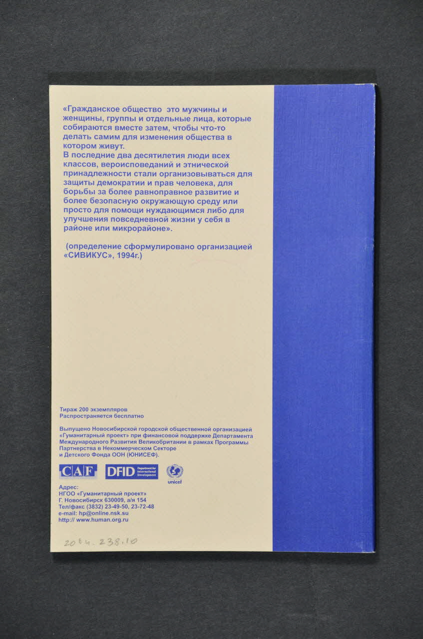 e-mail: hp@online.nsk.su // http://www.human.org.ru (Dans la partie inférieure, en caractères bleus sur fond gris), versoLogo