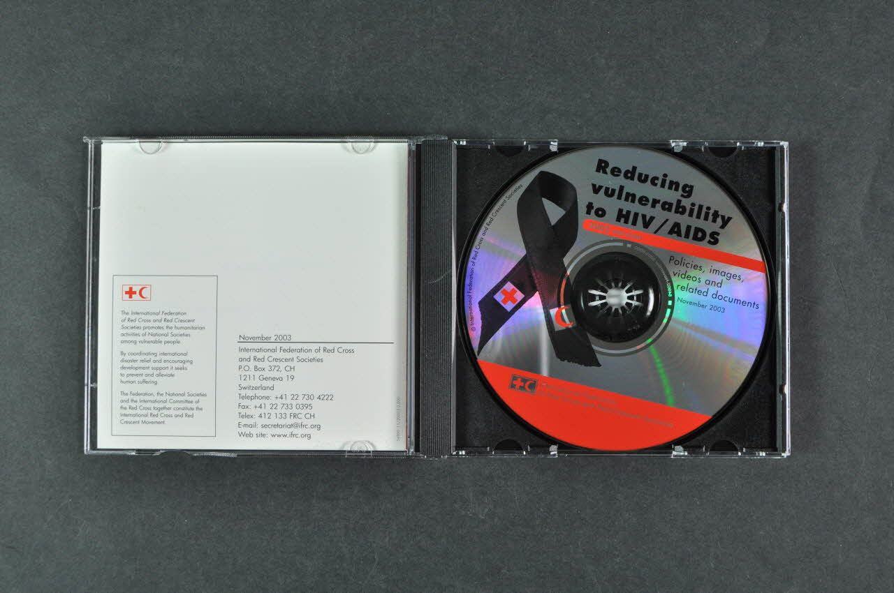 Le recto du CDrom et celui du fascicule présentent une composition similaire : ruban sur la gauche (rouge pour le .3, gris pour le CD) ; titre en haut à droite souligné d'un bandeau rouge ; bandeau inférieur rouge. Le CD a un fond argenté, le fascicule un fond rouge avec les lettres "AIDS" blanches floues. L'intérieur du .3 contient des données techniques en noir sur fond blanc. L'arrière comporte à gauche un texte de présentation des associations, et à droite leurs coordonnées. Le boîtier est composé d'un support en plastique noir dans une coque en plastique transparent. Une feuille de papier glacé imprimé est insérée sur l'arrière, portant les mêmes inscriptions que le verso du fascicule. Elle se replie au niveau du dos, avec le titre sur un fond rouge. Contenu du CDrom : essentiellement des rapports et un film : orphelins en AfriqueInscriptions