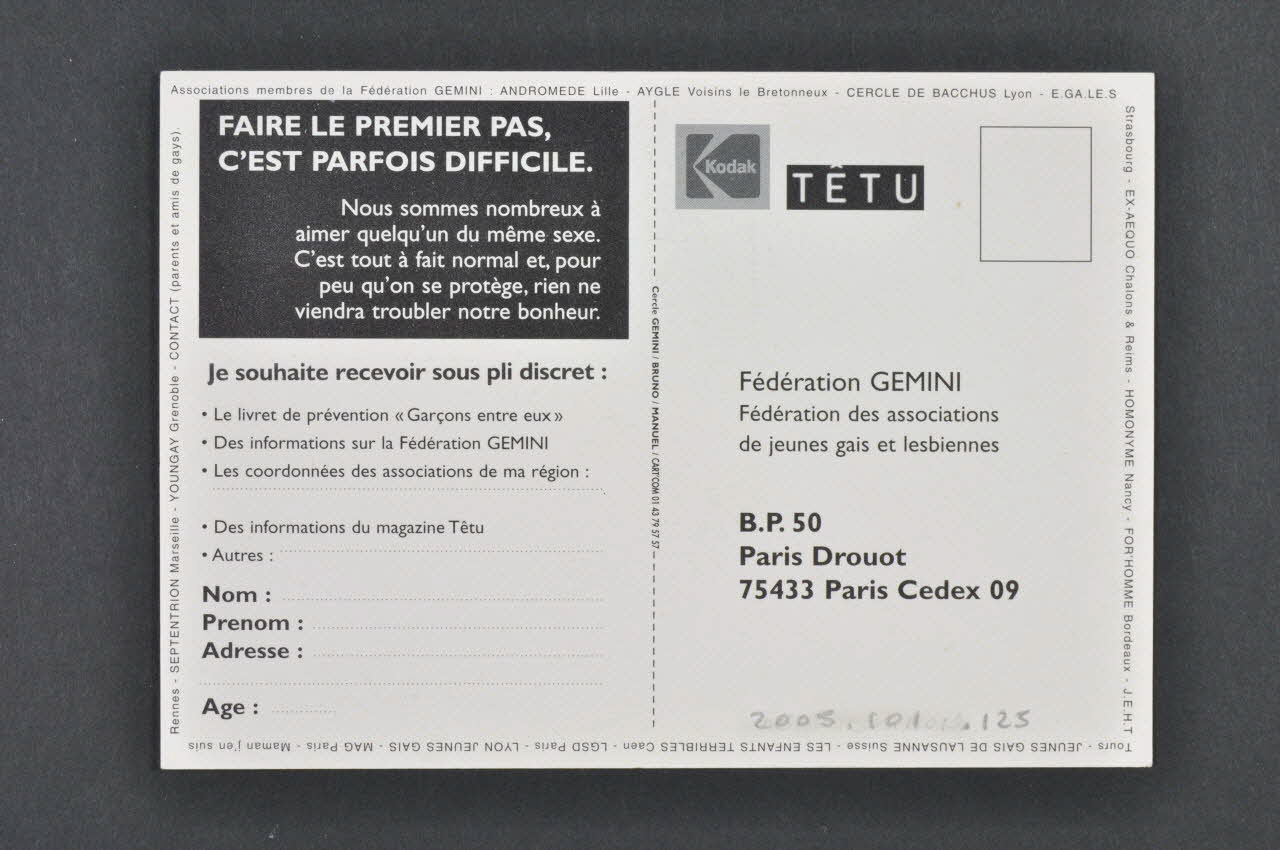 Fédération GEMINI // Fédération des associations // de jeunes gais et lesbiennes // B.P.50 Paris Drouot // 75433 Paris Cedex 09 (à droite), versoDécor