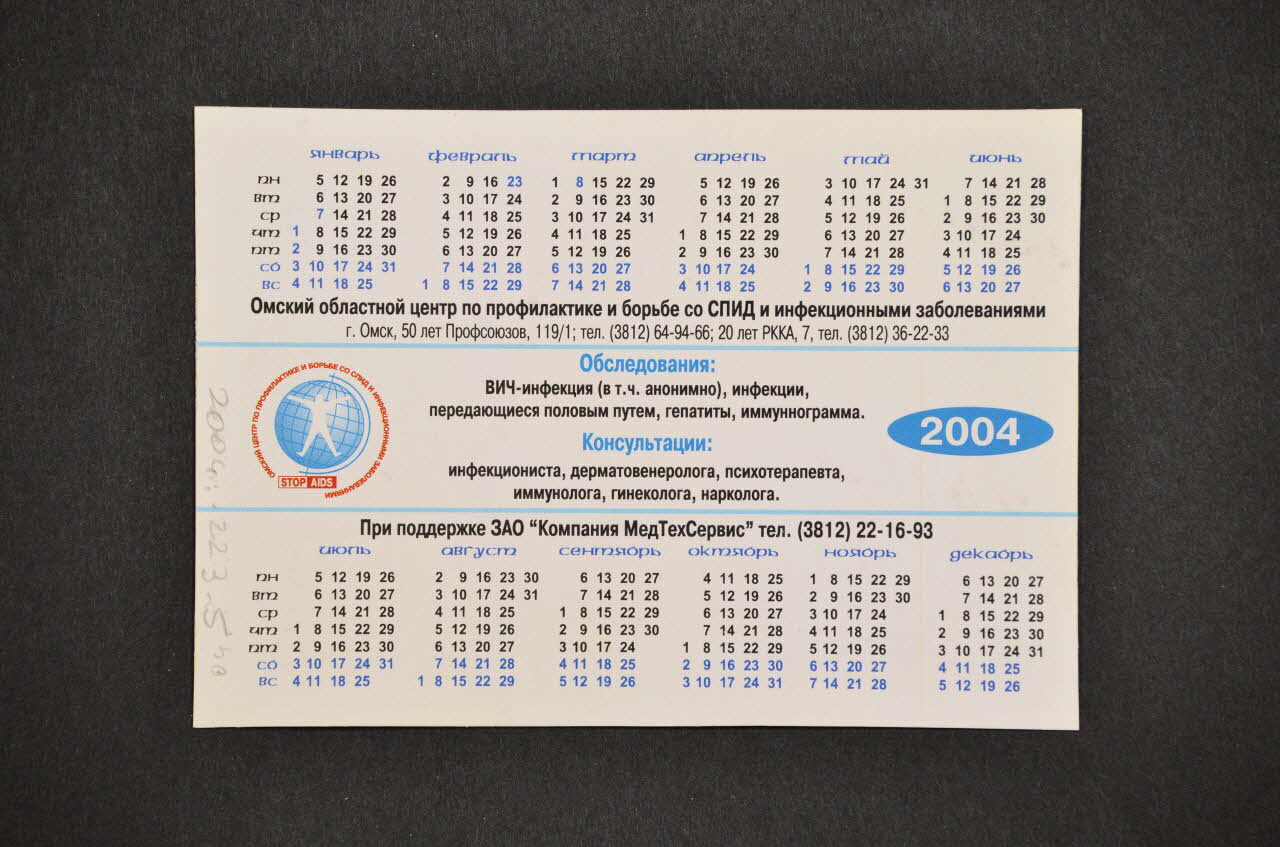 Le recto présente une photographie d'une discothèque où il y a des jeunes filles en rouge et vert. Sur le côté supérieur à gauche se trouvent des inscriptions en caractères cyrilliques blanches. Sur le côté inférieur gauche est présenté le logo du centre. Le verso a un fond blanc sur lequel se trouve un calendrier en caractères noirs et bleus. Au centre est situé le logo du centre.Décor