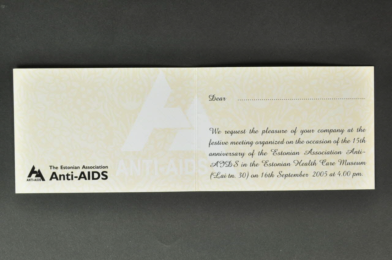 We request the pleasure of your company at the festive meeting organized on the occasion of the 15th anniversary of the Estonian Association Anti-AIDS in the Estonian Health Care Museum (Lai tn. 30) on 16th September 2005 at 4.00 pm. (Paragraphe d'invitation, description de la soirée.), à l'intérieurLogo