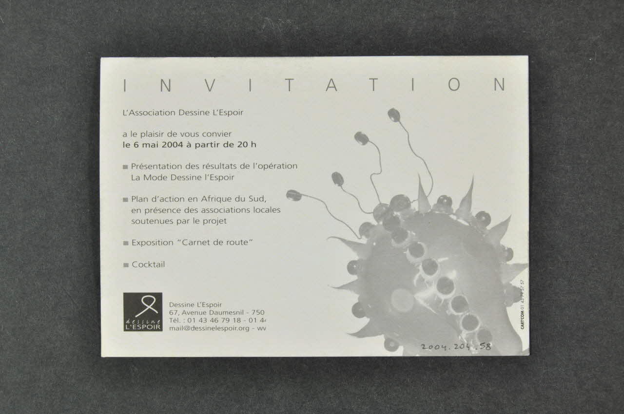 L'Association Dessine l'Espoir // // a le plaisir de vous convier // le 6 mai 2004 à partir de 20h // // - Présentation des résultats de l'opération // La Mode Dessine l'Espoir // // - Plan d'action en Afrique du Sud, // en présence des associations locales // soutenues par le projet // // - Exposition "Carnet de route" // // -Cocktail (Imprimés en grisé, horizontalement), versoDécor