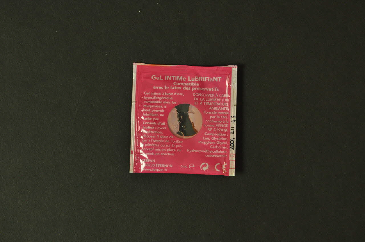 Le gel lubrifiant est contenu dans un emballage carré, aux bords thermo-collés. Au recto, sont imprimés, en orange et en rose, un homme et une femme en buste. Un texte est imprimé en blanc sur fond rose au verso. Un cercle transparent est dessiné au centre, au recto et au verso.Inscriptions