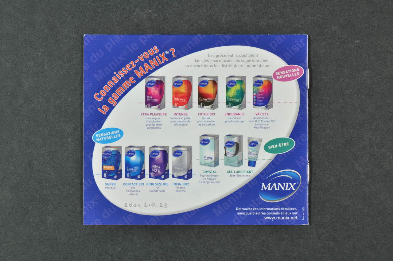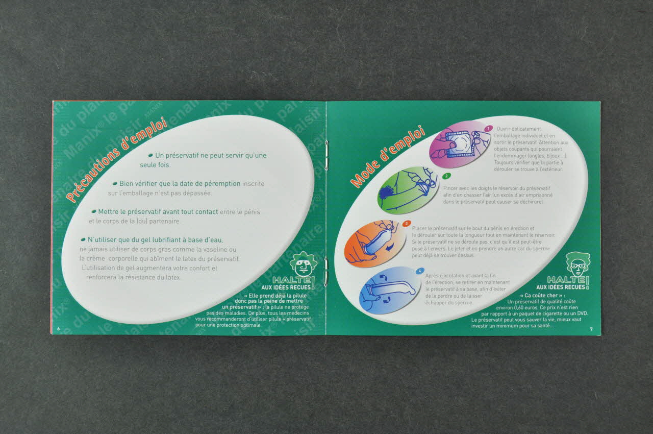 Historique et fabrication // Les IST // Le VIH // Précautions d'emploi // Mode d'emploi // Que dois-je faire? // Quelques chiffres inquiétants // Numéros utiles // Nous contacter (Chaque page comporte un grand titre marqué dans l'angle supérieur gauche ou droit.), à l'intérieurConnaissez-vous // la gamme MANIX? (Le titre est marqué en rouge dans l'angle supérieur gauche.), versoAdresse