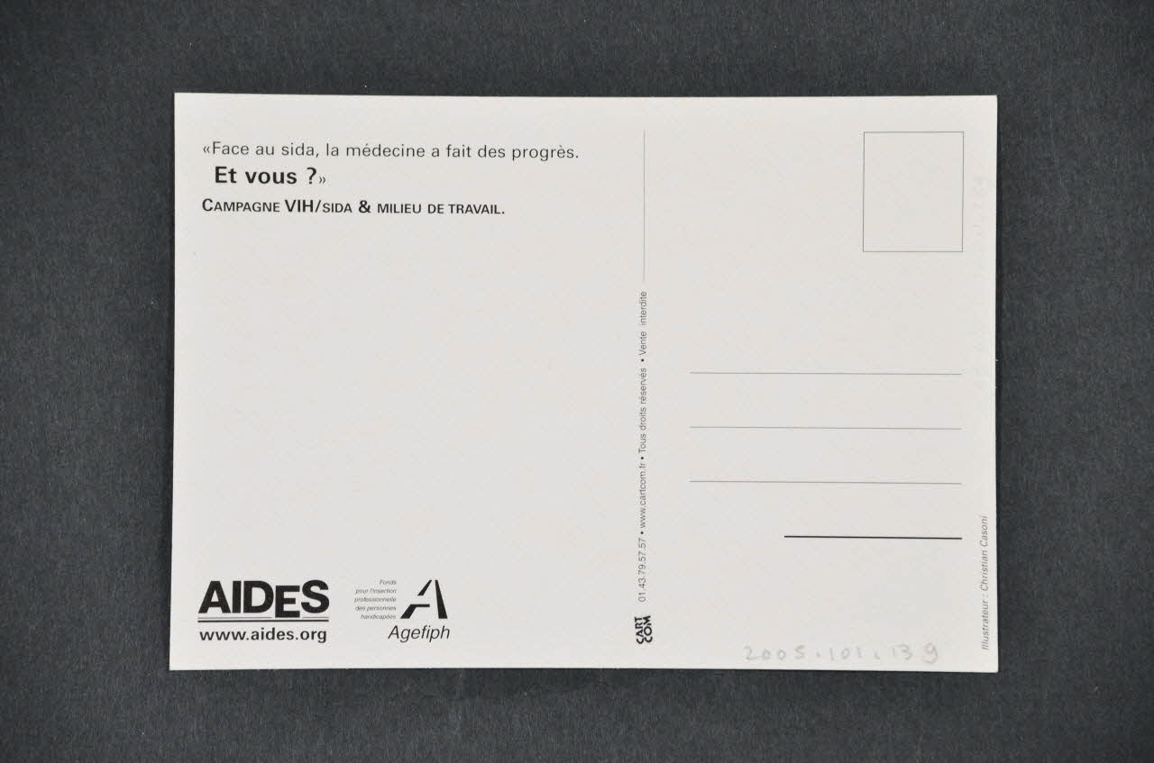 "ICI AUCUN RISQUE, LE VIRUS NE SE // TRANSMET PAS COMME CA" (Imprimé en capitales noires dans le haut à droite), recto"Face au sida, la médecine a fait des progrès. // Et vous ?" // CAMPAGNE VIH/SIDA & MILIEU DE TRAVAIL. (Imprimé en noir sur blanc dans l'angle supérieur gauche), versoLogo
