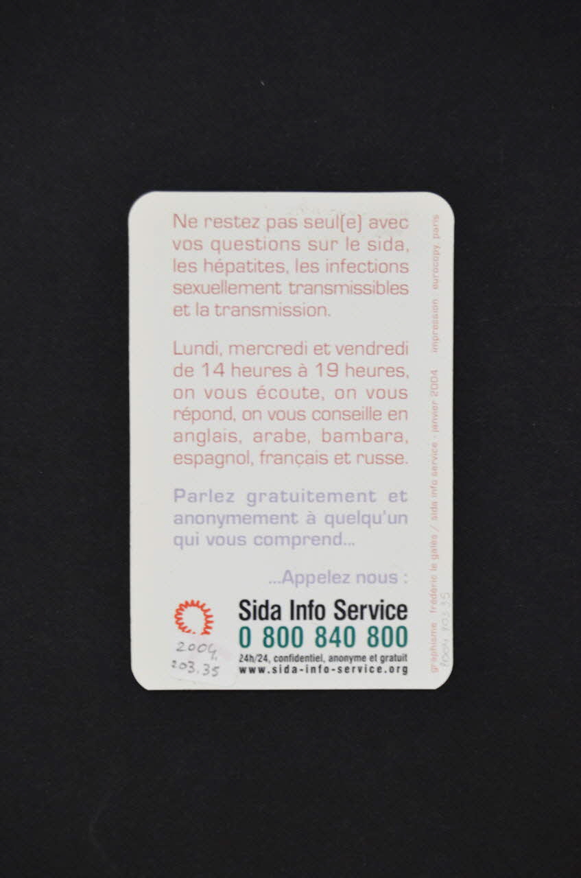 Résumé. "Ne restez pas seul(e) avec vos questions sur le sida, les hépatites, les infections sexuellement transmissibles et la transmission. / Lundi, mercredi et vendredi de 14 heures à 19 heures, on vous écoute, on vous répond, on vous conseille en anglais, arabe, bambara, espagnol, français et russe. / Parlez gratuitement et anonymement à quelqu'un qui vous comprend... / Appelez nous :"