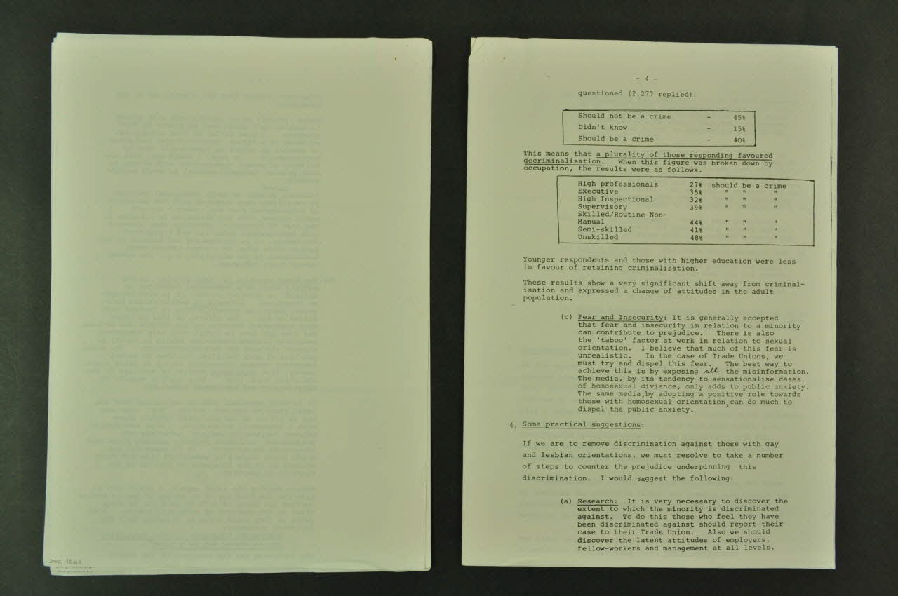 Il s'agit d'une intervention faite au Séminaire sur l'orientation sexuelle dans les lieux de travail tenu au "People's College" à Dublin, le 29 novembre 1985. - Facteurs influençant les préjugés : Ignorance et peur, notamment l'idée fausse que ce sont les personnes à orientation homosexuelles qui sont le plus à même de transmettre le virus du sida, alors que c'est la "promiscuité" chez les hétérosexuels comme chez les homosexuels / La condamnation légale de l'homosexualité active (résultats d'une enquête) - Suggestions pratiques : en particulier, le rôle des syndicats