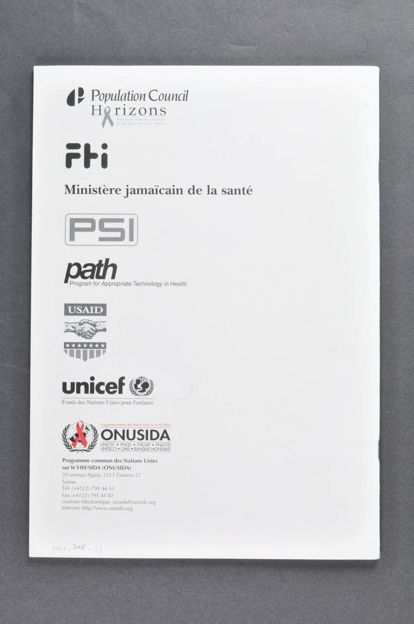 Rapport d'une consultation coparrainée par l'ONUSIDA, Horizons/Population Council, FHI, Le Ministère jamaïcain de la santé, PSI/Aids Mark, Path, l'USAID, l'UNICEF. (Page intérieure :)Collection Meilleures Pratiques de l'ONUSIDA / OUTILS FONDAMENTAUX, sur la couvertureNom d'association, logo