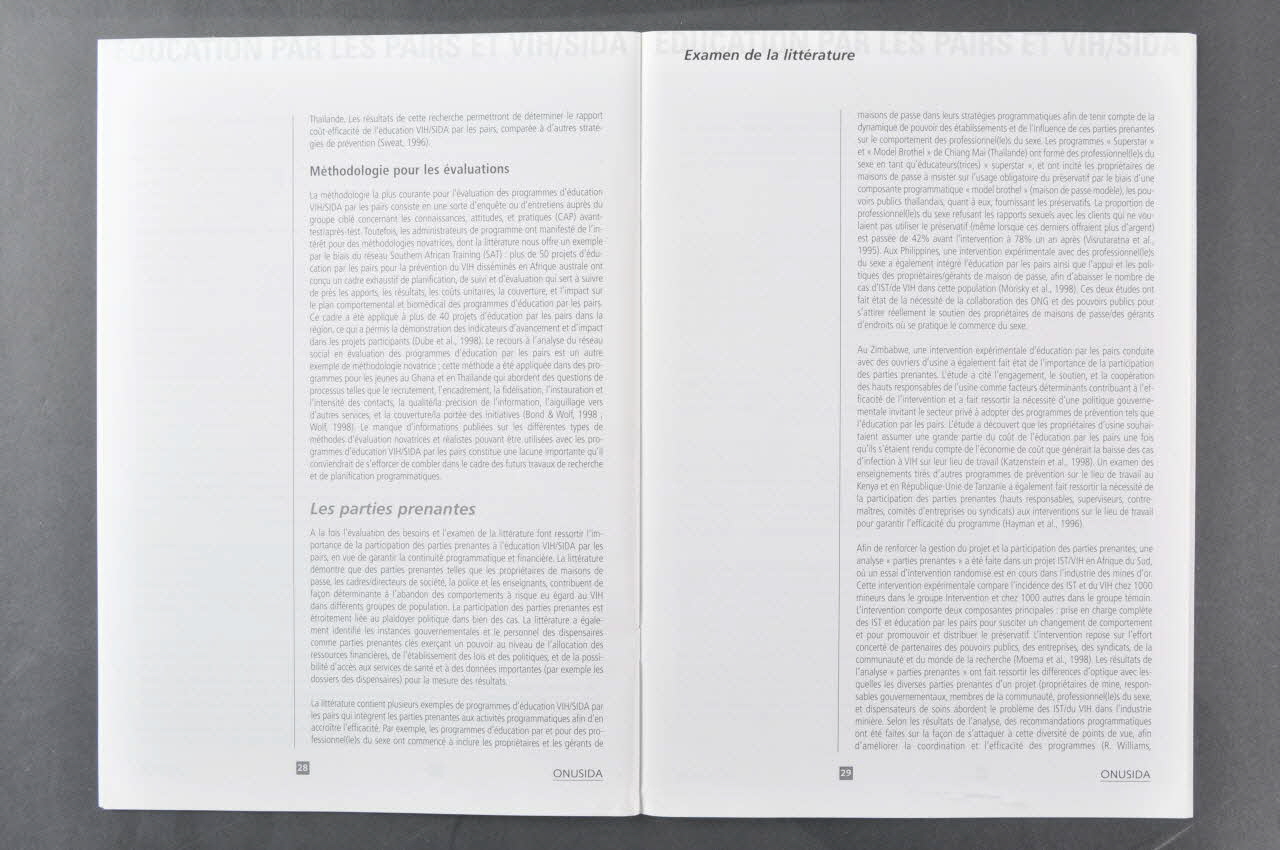 En haut, en caractères noirs y figure le titre. En dessous, en biais, un grand ruban rouge est dessiné à cheval sur trois carrés gris, au dessus du logo de ONUSIDA. Tout en bas, à droite, en biais sur petit bandeau rouge se trouve le titre de la collection. Sur le dos à fond blanc, on toruve, verticalement, les logos des partenaires et en bas logo et coordonnées d'ONUSIDA. L'intérieur présente des impressions noires sur fond blanc.Inscriptions