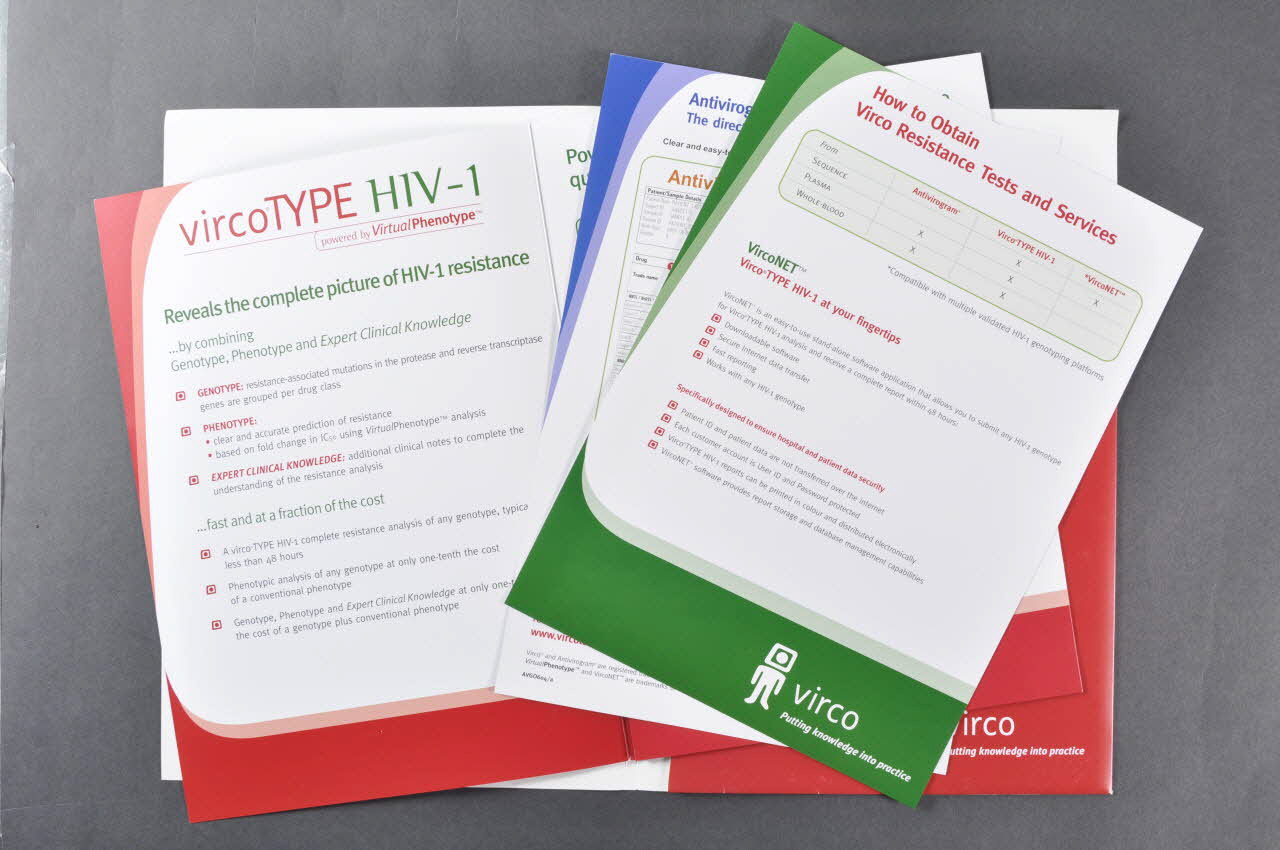 Dossier en carton blanc de format A4, dont la couverture présente une hélice d'ADN, contenant un dépliant présentant des tests de résistance produits par le laboratoire Virco.