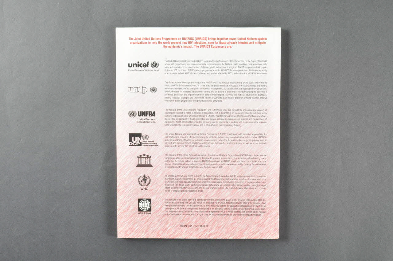 Au dos, on trouve la description des sept organisations de l'ONU formant ONUSIDA : Unicef, Undp, Unfpa, Undcp, Unesco, OMS, Banque mondiale.