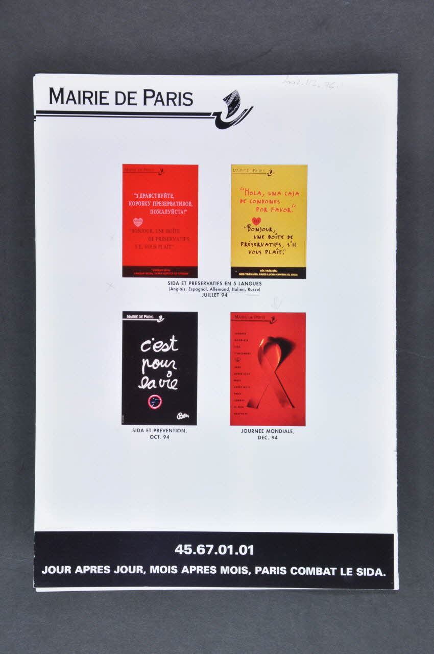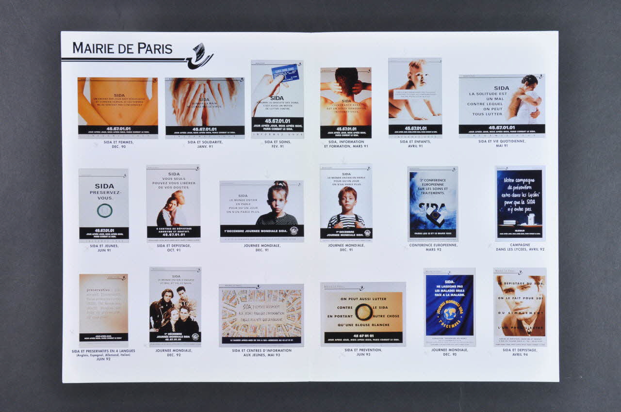 - (Sida. Un enfant par jour naît séropositif, et combien demain, si les femmes ne se sentent pas concernées? ) "Sida et Femmes" Déc 90 // - (Sida. Donner la main ne donne pas le virus") "Sida et solidarité", Janv 91 // - (Sida. Assurer la gratuité des soins, c'est aussi un moyen de lutter contre.) "Sida et soins", Fév 91 // - (Sida. L'ignorance aussi est un virus dangereux. Informez-vous "Sida, Information et Formation" Mars 91 // - (Sida. Ils ne comprennent pas pourquoi ils en sont victimes. ils comprendraient encore moins d'être rejetés) "Sida et enfants" Avril 91 // - (Sida, la solitude est un mal contre lequel on peut lutter) "Sida et vie quotidienne", mai 91 // - (Sida. Préservez-vous) "Sida et jeunes", Juin 91 // - (Sida. Vous seuls pouvez vous libérer de vos doutes) "Sida et dépistage", Oct 91 // - (Sida. Le monde entier en parle pour qu'un jour on n'en parle plus) "Journée mondiale" (horiontale) , Déc 91 // - (Sida. Le monde entier en parle pour qu'un jour on n'en parle plus) "Journée mondiale" (verticale) , Déc 91 // - (3° Conférence européenne sur les soins et les traitements) "Conférence européenne", mars 92 // - (Notre campagne de prévention entre dans les lycées pour que le SIDA n'y entre pas.) "Campagne dans les lycées", avril 92 // - (Preservativo : préservatif . unica proteioe contro l'AIDS. Dal farmacista, chiedi : Bonjour, une boite de préservatifs s'il vous plaît) "Sida et préservatifs en 4 langues (Anglais, espagnol, Allemand, Italien)", Juin 92 // - (Sida. Le monde entier s'engage et moi, et toi, et nous) "Journée mondiale" Déc 92 // - (Sida. 3 centres répondent aux jeunes. pour que l'information circule plus vite que la maladie) " Sida et centres d'information aux jeunes" Mai 93 // - (On peut aussi lutter contre le sida en portant autre chose qu'une blouse blanche) "Sida et prévention", Juin 93 // - (Sida. Ne laissons pas les malades seuls face à la maladie) "Journée mondiale", Dec 93 // - (Le dépistage du Sida, on le fait pour soi ou simplement l'un pour l'autre) "Sida et dépistage", avril 94. // - (Hola, una caja de cindones por favor. Pide. Bonjour, une boite de préservatifs s'il vous plaît) "Sida et préservatifs en 5 langues (Anglais, Espagnol, Allemand, Italien, Russe)" , juillet 94. // - (C'est pour la vie. Ben) "Sida et prévention" Oct 94 // - (Journée mondiale sida 1er décembre) "Journée mondiale", déc 94 (liste des affiches (reproduction couleur 4 x 6,5 cm) avec leur transcription et la date)Logo, nom d'association