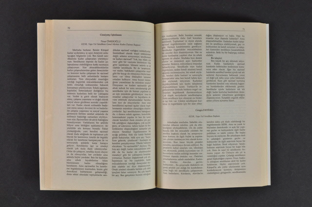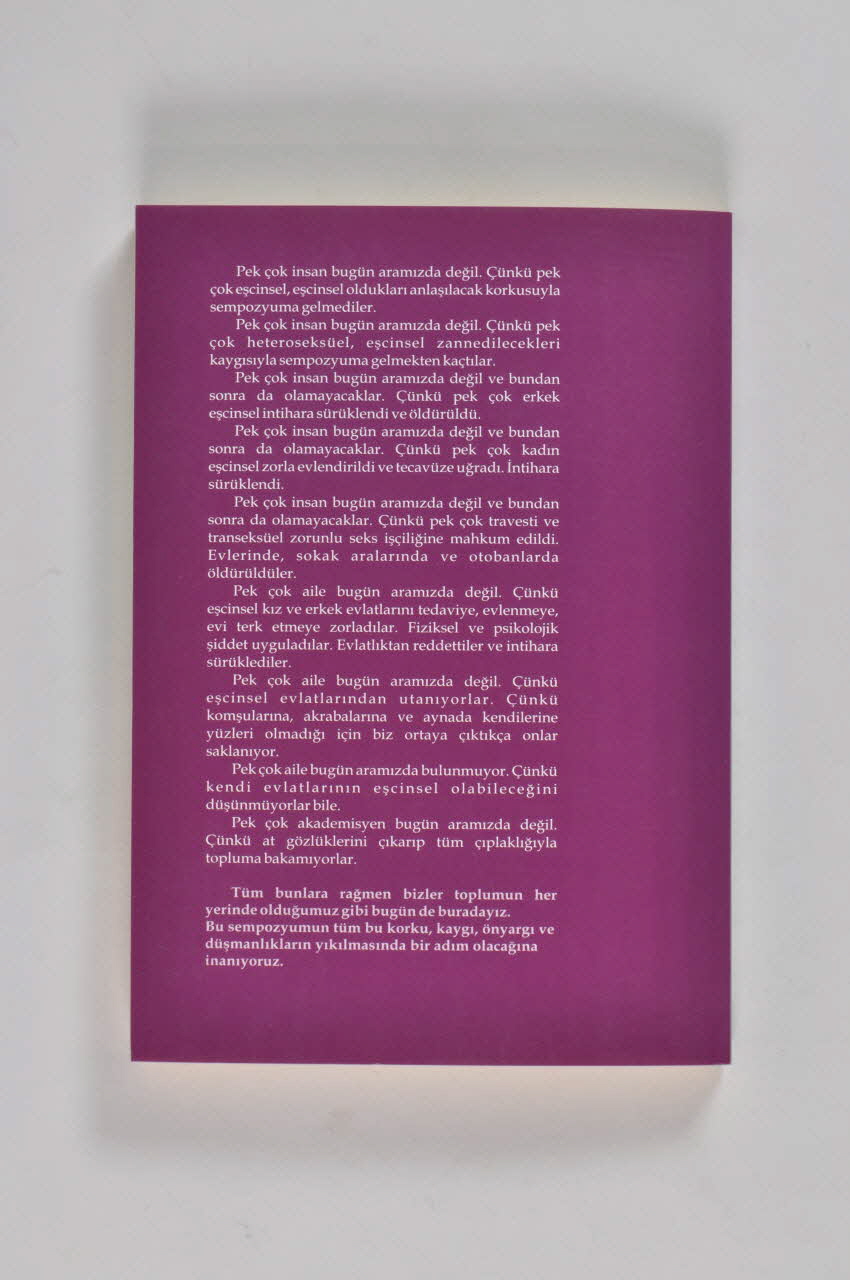 - Acilis konusmalari // - Cerceve sunumlar // - Birinci Oturum : Isan haklari çerçevesinde gey ve lezbiyen haklari // - Ikinci Oturum : Toplumsal bir hareket olarak escinsel kurtulus hareketi // - Serbest bildiri sunumlari // - Ucüncü Oturum : çalisma hayatinda ve sendiklarda gey ve lezbiyen isçi ve memurlarin sorunlari // - Birinci Oturum : Popüler kültür ve medyada escinselligin "Oteki" olarak sunumu. // - Serbest bildiri sunumlari // - Ikinci Oturum : Erkekligin ve kadinligin toplumsal kurulusu ve degisimi // - Uçüncü Oturum : Escinsellere yönelik siddetin sosyo-kültürel boyutlari // - Forum (Titres des sessions :)JAOS GL SEMPOZYUMU 23-24 MAYIS 2003 (Dates du colloque sur la couverture.)Décor